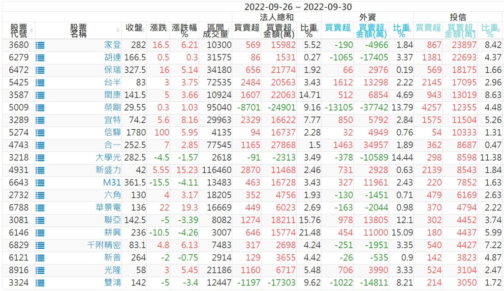 2022/09/26~2022/09/30近5日【投信】買賣超個股 2022-10-02 股狗網小編 投資誌-大盤 發表留言 投資達人APP上線囉!!!『安裝APP』: 【上市投信買超個股】(以金額排行,單位:萬) 【上市投信賣超個股】(以金額排行,單位:萬) 【上櫃投信買超個股】(以金額排行,單位:萬) 【上櫃投信賣超個股】(以金額排行,單位:萬) 免責宣言 本網站文章所提供資訊僅供參考,並無任何推介買賣之意,投資人應自行承擔交易風險。 分享此文: 按一下即可分享至 X(在新視窗中開啟) X 按一下以分享至 Facebook(在新視窗中開啟) Facebook 喜歡 正在載入...