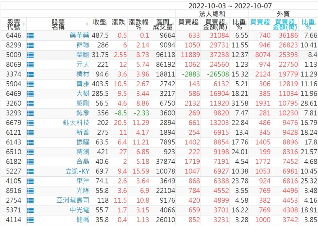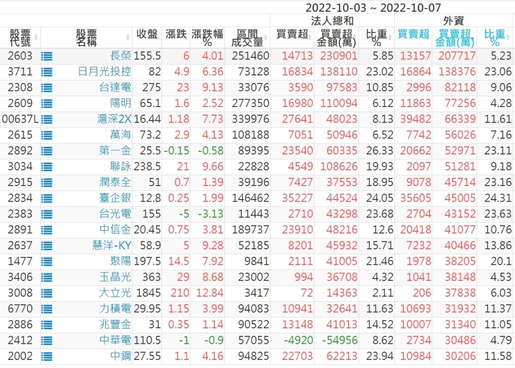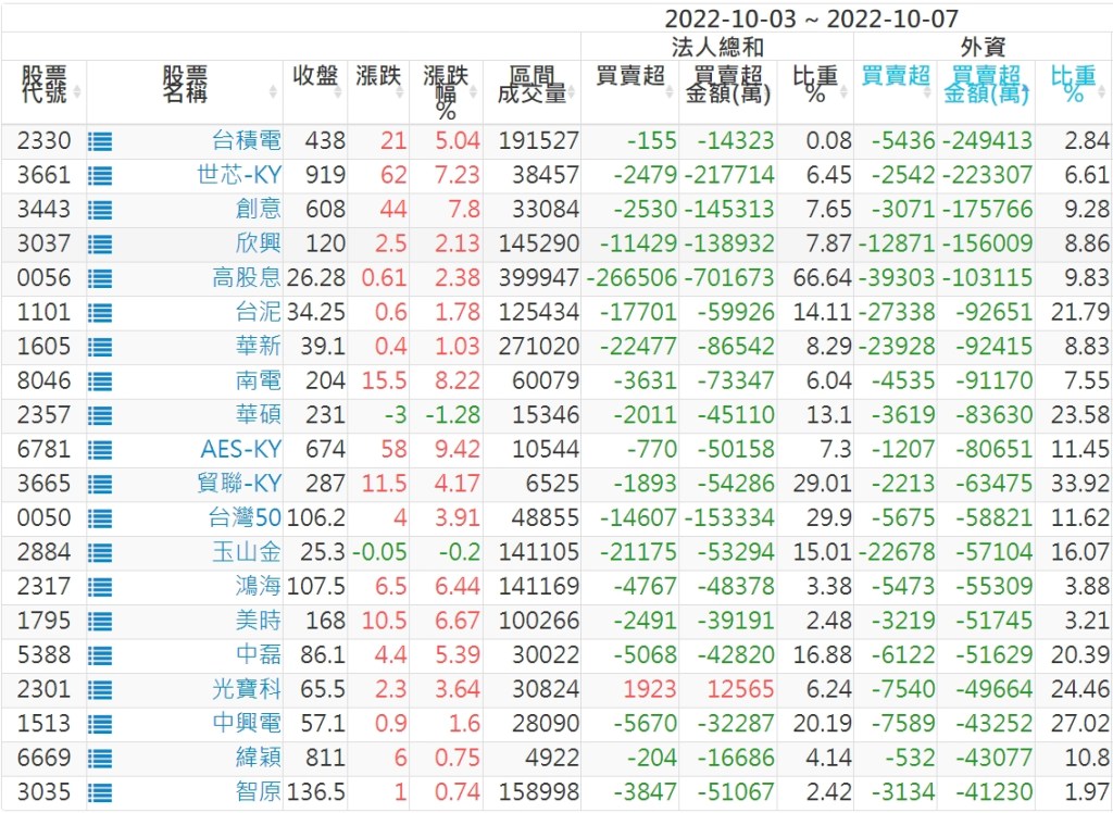 2022/10/03~2022/10/07近5日【外資】買賣超個股 2022-10-09 股狗網小編 投資誌-大盤 發表留言 投資達人APP上線囉!!!『安裝APP』: 外資本周累積【買超】約52億元。 【上市外資買超個股】(以金額排行,單位:萬) 【上市外資賣超個股】(以金額排行,單位:萬) 【上櫃外資買超個股】(以金額排行,單位:萬) 【上櫃外資賣超個股】(以金額排行,單位:萬) 免責宣言 本網站文章所提供資訊僅供參考,並無任何推介買賣之意,投資人應自行承擔交易風險。 分享此文: 按一下即可分享至 X(在新視窗中開啟) X 按一下以分享至 Facebook(在新視窗中開啟) Facebook 喜歡 正在載入...