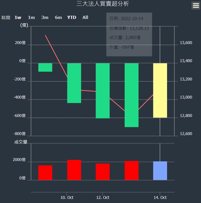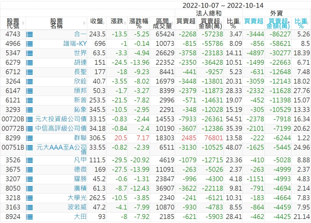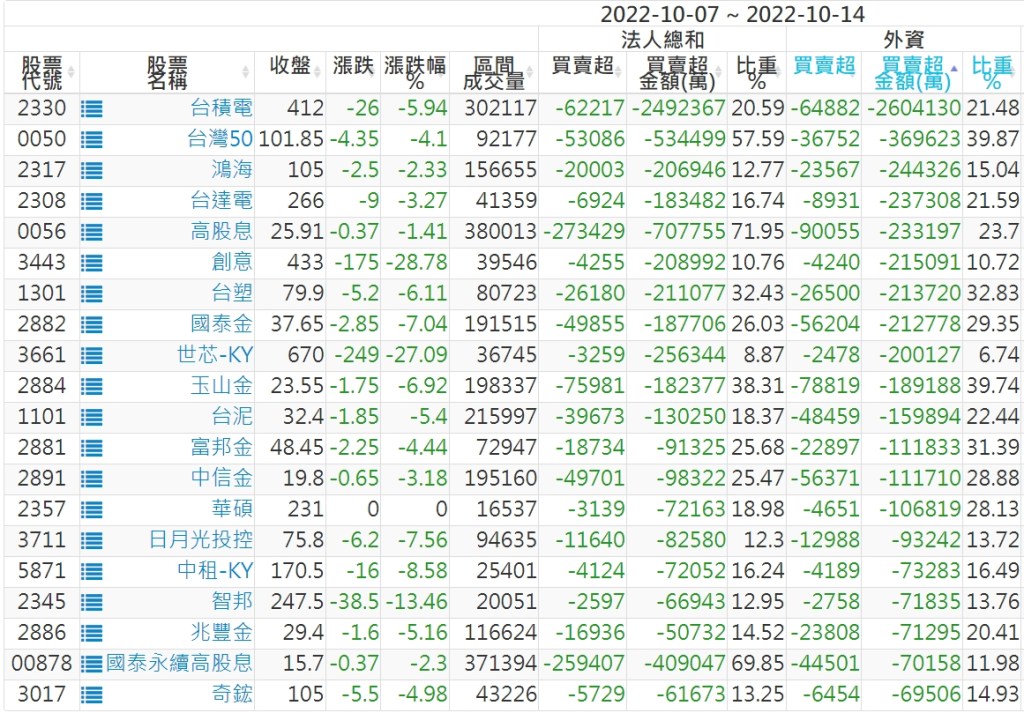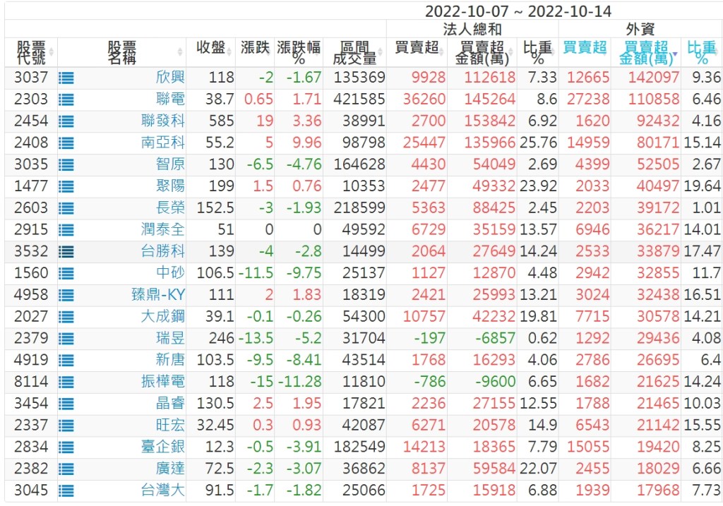 2022/10/07~2022/10/14近5日【外資】買賣超個股 2022-10-16 股狗網小編 投資誌-大盤 發表留言 投資達人APP上線囉!!!『安裝APP』: 外資本周累積【賣超】約597億元。 【上市外資買超個股】(以金額排行,單位:萬) 【上市外資賣超個股】(以金額排行,單位:萬) 【上櫃外資買超個股】(以金額排行,單位:萬) 【上櫃外資賣超個股】(以金額排行,單位:萬) 免責宣言 本網站文章所提供資訊僅供參考,並無任何推介買賣之意,投資人應自行承擔交易風險。 分享此文: 按一下即可分享至 X(在新視窗中開啟) X 按一下以分享至 Facebook(在新視窗中開啟) Facebook 喜歡 正在載入...