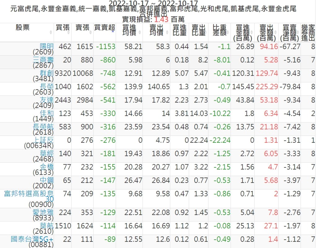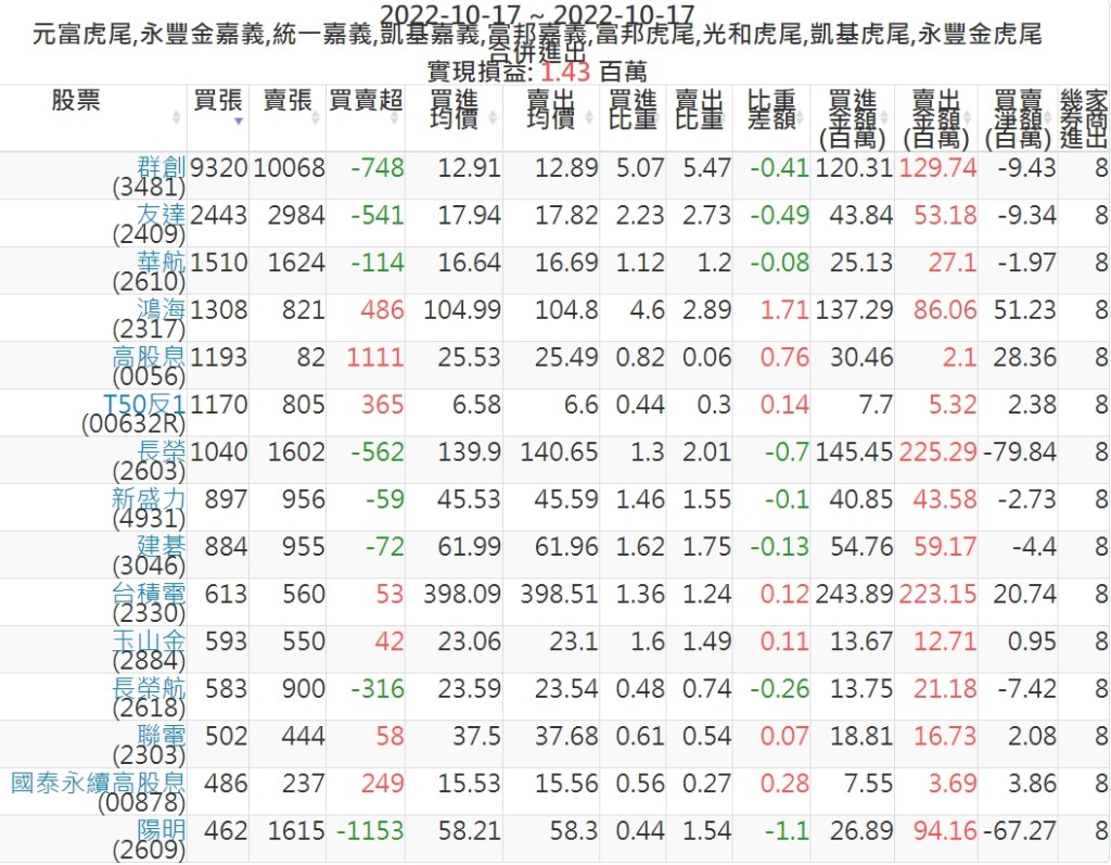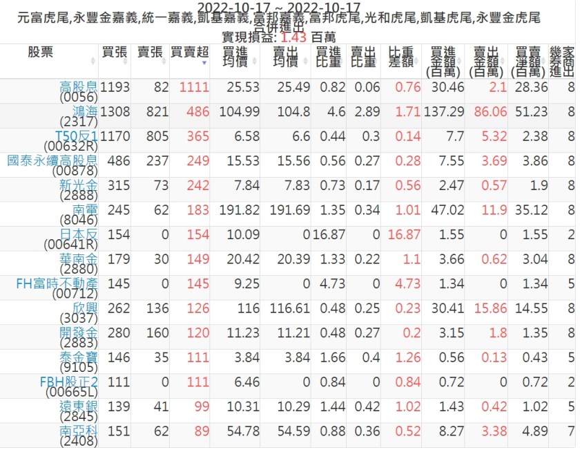 2022-1017主力買賣超個股 2022-10-18 股狗網小編 籌碼面每日資訊 發表留言 投資達人APP上線囉!!!『安裝APP』: 可參考下文 『如何查詢當沖、隔日沖分公司券商買賣』 主力當沖券商: 『元富虎尾』,『永豐金嘉義』,『統一嘉義』,『凱基嘉義』,『富邦嘉義』,『富邦虎尾』,『光和虎尾』,『凱基虎尾』,『永豐金虎尾』。 『當沖標的』 『買超股票』 『賣超股票』 免責宣言 本網站文章所提供資訊僅供參考,並無任何推介買賣之意,投資人應自行承擔交易風險。 分享此文: 按一下即可分享至 X(在新視窗中開啟) X 按一下以分享至 Facebook(在新視窗中開啟) Facebook 喜歡 正在載入...