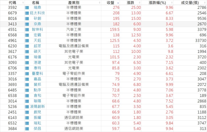 2022-1109股價創20日新高爆量上漲股 2022-11-10 股狗網小編 選股條件 發表留言 投資達人APP上線囉!!!『安裝APP』: 利用股狗選股的選股條件可以【挑選突破20日新高,爆量上漲起漲點股票】 1.股狗選股 https://www.stockdog.com.tw 2.選股條件: a.收盤價創20日新高 b.當日漲幅 > 2% 免責宣言 本網站文章所提供資訊僅供參考,並無任何推介買賣之意,投資人應自行承擔交易風險。 分享此文: 按一下即可分享至 X(在新視窗中開啟) X 按一下以分享至 Facebook(在新視窗中開啟) Facebook 喜歡 正在載入...
