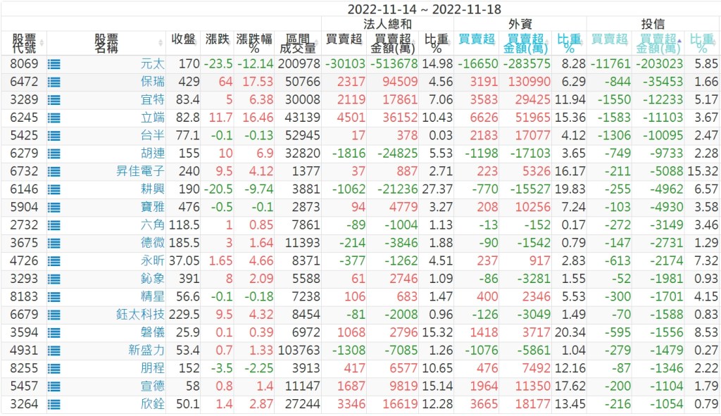 2022/11/14~2022/11/18近5日【投信】買賣超個股 2022-11-20 股狗網小編 投資誌-大盤 發表留言 投資達人APP上線囉!!!『安裝APP』: 【上市投信買超個股】(以金額排行,單位:萬) 【上市投信賣超個股】(以金額排行,單位:萬) 【上櫃投信買超個股】(以金額排行,單位:萬) 【上櫃投信賣超個股】(以金額排行,單位:萬) 免責宣言 本網站文章所提供資訊僅供參考,並無任何推介買賣之意,投資人應自行承擔交易風險。 分享此文: 按一下即可分享至 X(在新視窗中開啟) X 按一下以分享至 Facebook(在新視窗中開啟) Facebook 喜歡 正在載入...