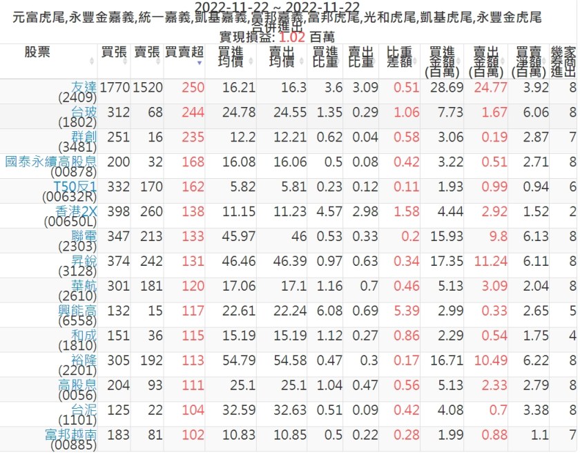 2022-1122主力買賣超個股 2022-11-23 股狗網小編 籌碼面每日資訊 發表留言 投資達人APP上線囉!!!『安裝APP』: 可參考下文 『如何查詢當沖、隔日沖分公司券商買賣』 主力當沖券商: 『元富虎尾』,『永豐金嘉義』,『統一嘉義』,『凱基嘉義』,『富邦嘉義』,『富邦虎尾』,『光和虎尾』,『凱基虎尾』,『永豐金虎尾』。 『當沖標的』 『買超股票』 『賣超股票』 免責宣言 本網站文章所提供資訊僅供參考,並無任何推介買賣之意,投資人應自行承擔交易風險。 分享此文: 按一下即可分享至 X(在新視窗中開啟) X 按一下以分享至 Facebook(在新視窗中開啟) Facebook 喜歡 正在載入...