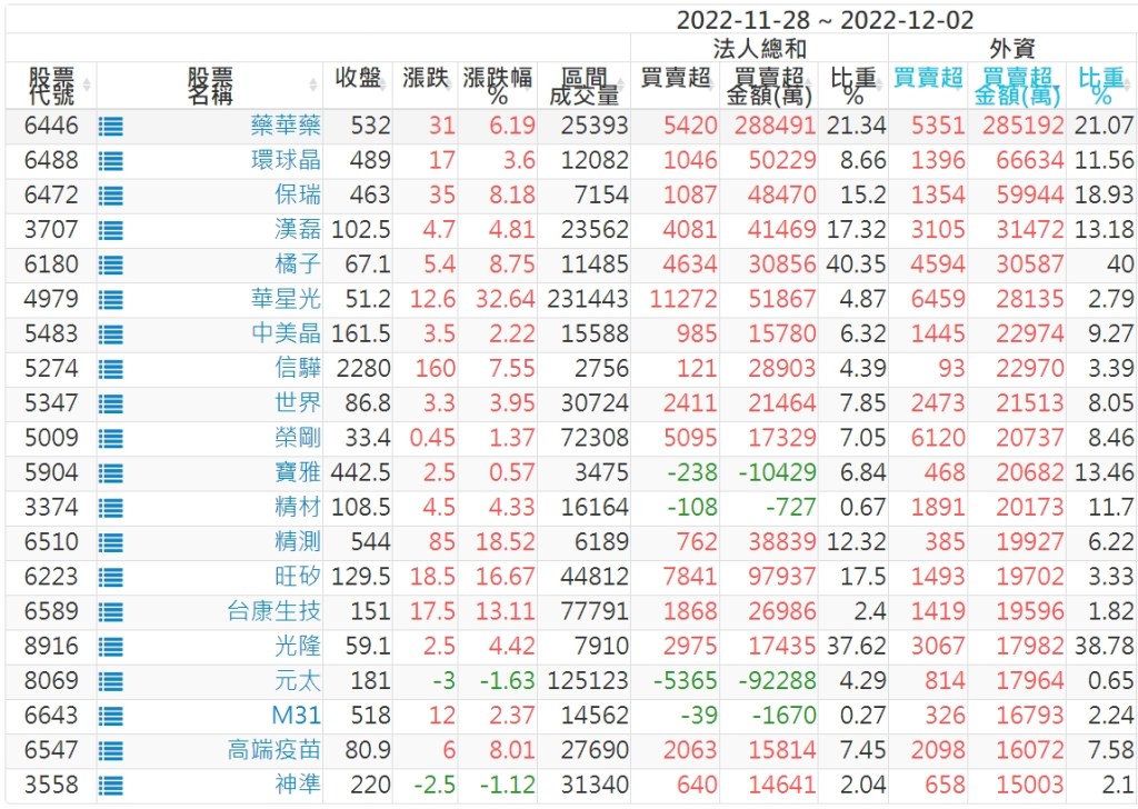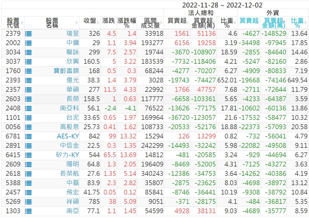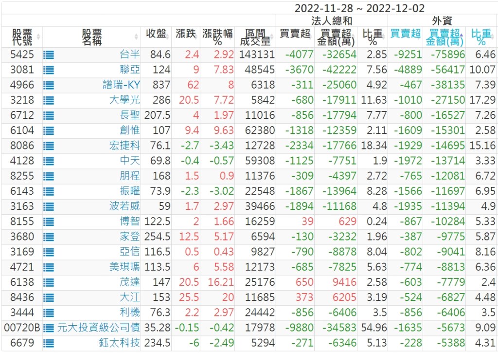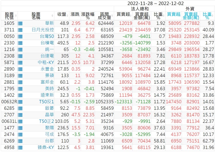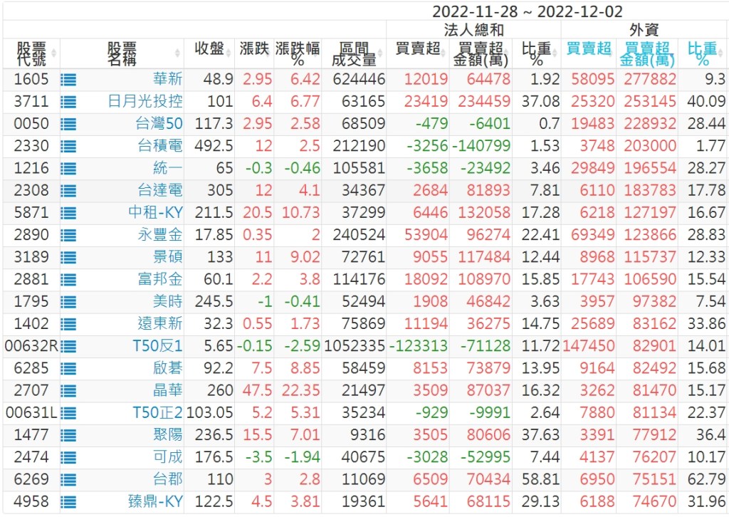 2022/11/28~2022/12/02近5日【外資】買賣超個股 2022-12-04 股狗網小編 投資誌-大盤 發表留言 投資達人APP上線囉!!!『安裝APP』: 外資本周累積【買超】約336億元。 【上市外資買超個股】(以金額排行,單位:萬) 【上市外資賣超個股】(以金額排行,單位:萬) 【上櫃外資買超個股】(以金額排行,單位:萬) 【上櫃外資賣超個股】(以金額排行,單位:萬) 免責宣言 本網站文章所提供資訊僅供參考,並無任何推介買賣之意,投資人應自行承擔交易風險。 分享此文: 分享到 X(在新視窗中開啟) X 分享到 Facebook(在新視窗中開啟) Facebook 喜歡 正在載入...