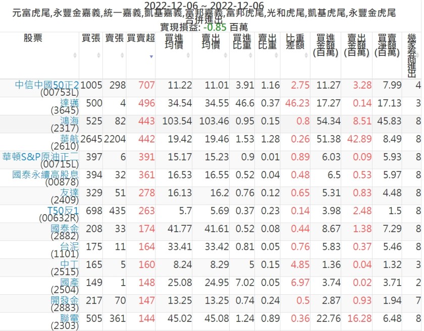 2022-1206主力買賣超個股 2022-12-07 股狗網小編 籌碼面每日資訊 發表留言 投資達人APP上線囉!!!『安裝APP』: 可參考下文 『如何查詢當沖、隔日沖分公司券商買賣』 主力當沖券商: 『元富虎尾』,『永豐金嘉義』,『統一嘉義』,『凱基嘉義』,『富邦嘉義』,『富邦虎尾』,『光和虎尾』,『凱基虎尾』,『永豐金虎尾』。 『當沖標的』 『買超股票』 『賣超股票』 免責宣言 本網站文章所提供資訊僅供參考,並無任何推介買賣之意,投資人應自行承擔交易風險。 分享此文: 按一下即可分享至 X(在新視窗中開啟) X 按一下以分享至 Facebook(在新視窗中開啟) Facebook 喜歡 正在載入...