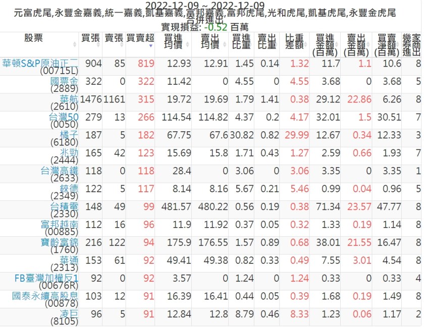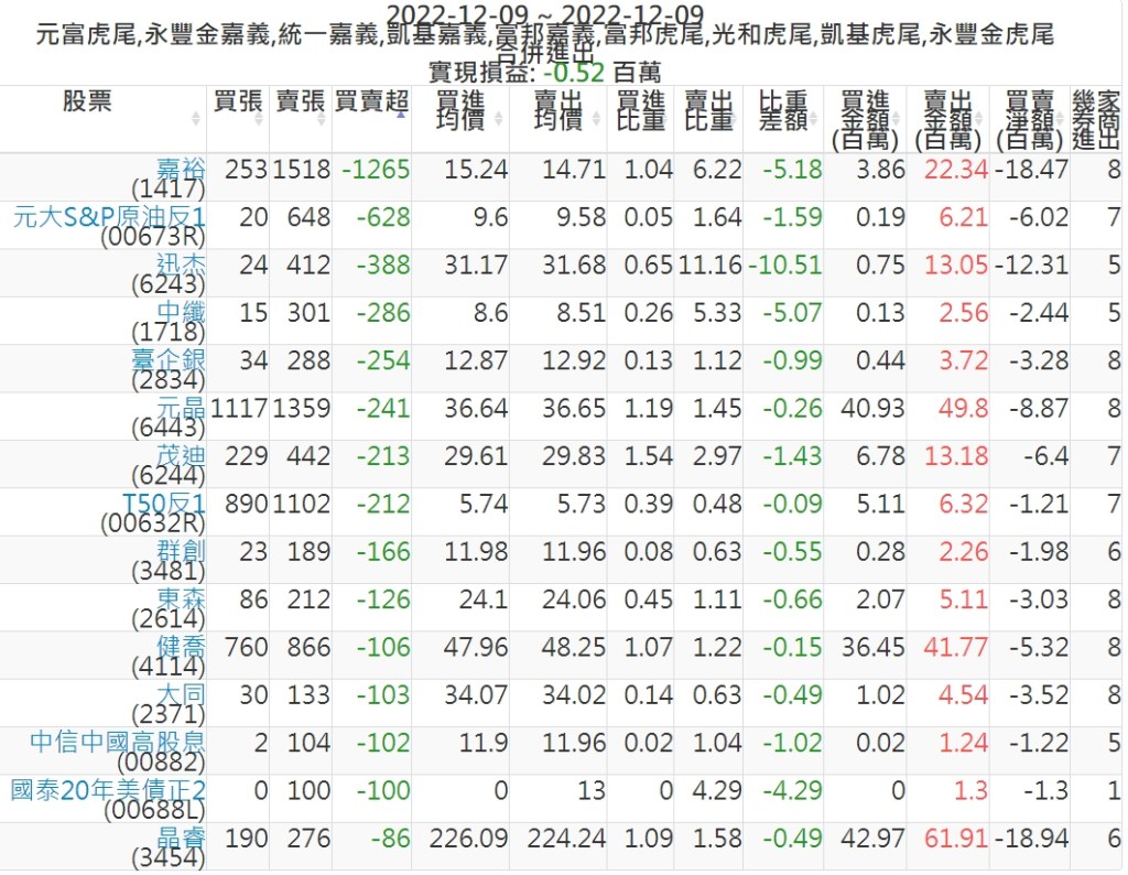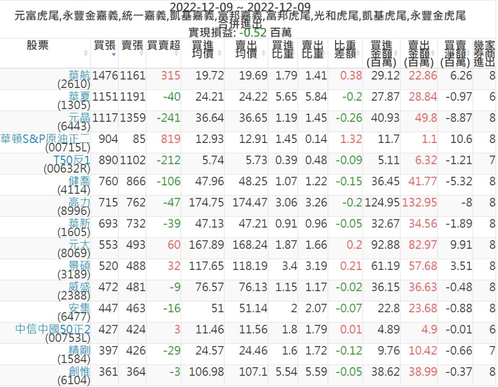 2022-1209主力買賣超個股 2022-12-10 股狗網小編 籌碼面每日資訊 發表留言 投資達人APP上線囉!!!『安裝APP』: 可參考下文 『如何查詢當沖、隔日沖分公司券商買賣』 主力當沖券商: 『元富虎尾』,『永豐金嘉義』,『統一嘉義』,『凱基嘉義』,『富邦嘉義』,『富邦虎尾』,『光和虎尾』,『凱基虎尾』,『永豐金虎尾』。 『當沖標的』 『買超股票』 『賣超股票』 免責宣言 本網站文章所提供資訊僅供參考,並無任何推介買賣之意,投資人應自行承擔交易風險。 分享此文: 分享到 X(在新視窗中開啟) X 分享到 Facebook(在新視窗中開啟) Facebook 喜歡 正在載入...