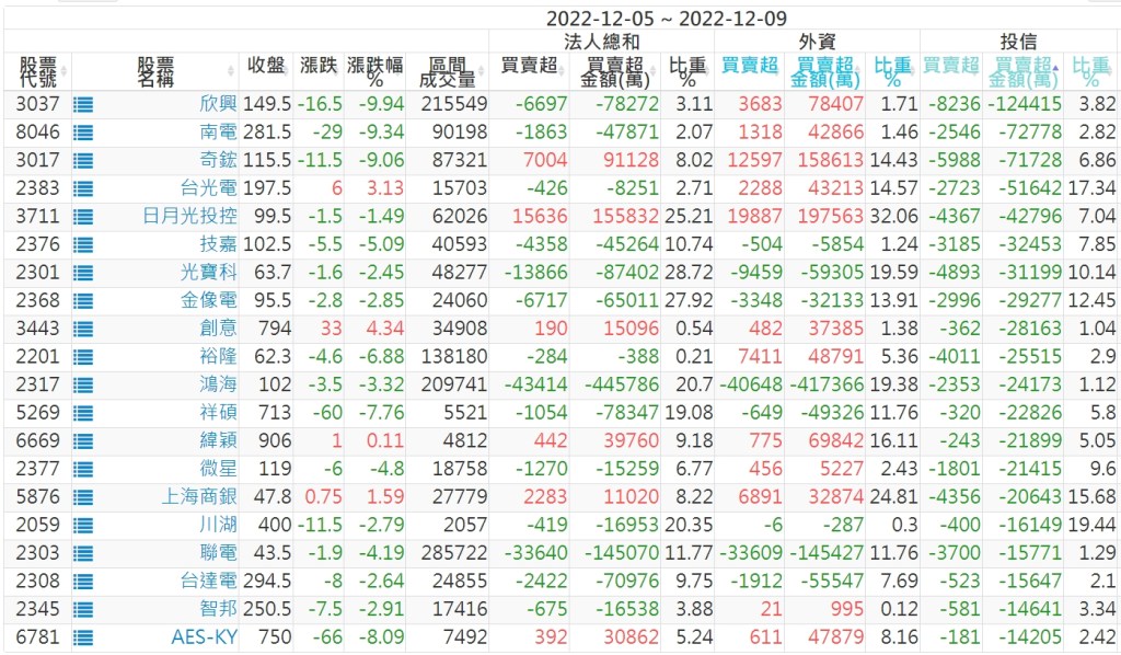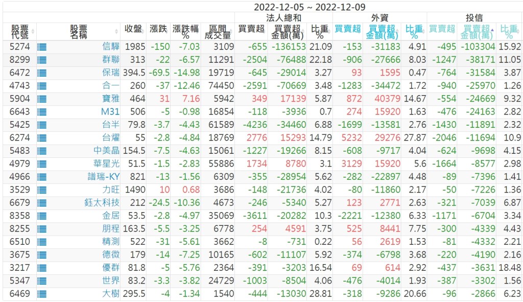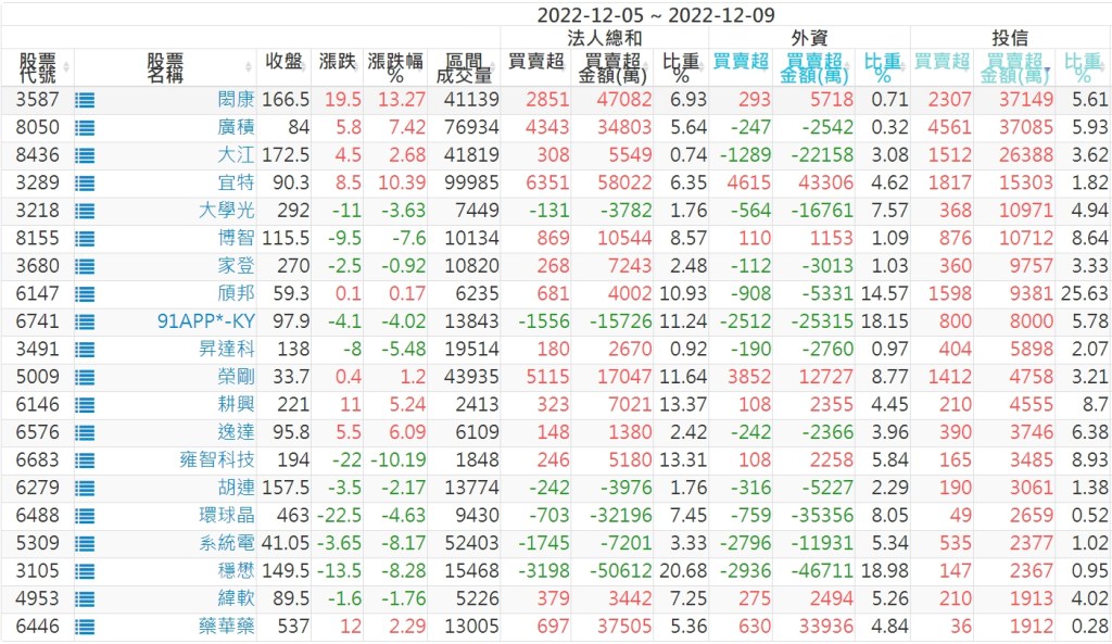2022/12/05~2022/12/09近5日【投信】買賣超個股 2022-12-11 股狗網小編 投資誌-大盤 發表留言 投資達人APP上線囉!!!『安裝APP』: 【上市投信買超個股】(以金額排行,單位:萬) 【上市投信賣超個股】(以金額排行,單位:萬) 【上櫃投信買超個股】(以金額排行,單位:萬) 【上櫃投信賣超個股】(以金額排行,單位:萬) 免責宣言 本網站文章所提供資訊僅供參考,並無任何推介買賣之意,投資人應自行承擔交易風險。 分享此文: 按一下即可分享至 X(在新視窗中開啟) X 按一下以分享至 Facebook(在新視窗中開啟) Facebook 喜歡 正在載入...