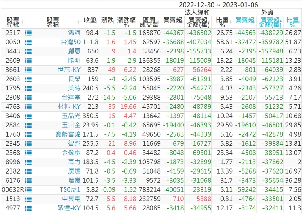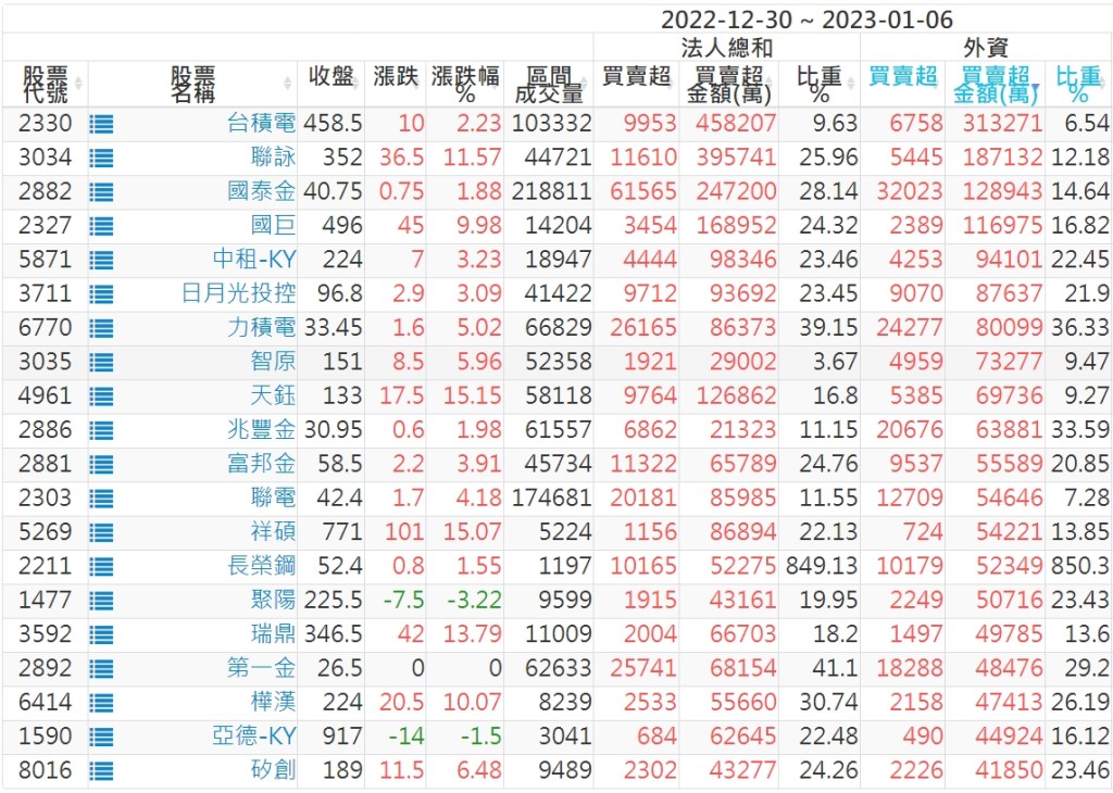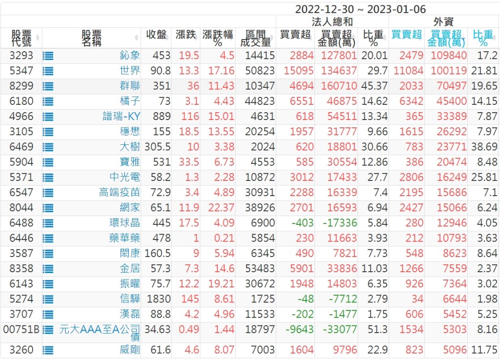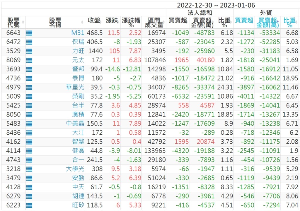 2022/12/30~2023/01/06近5日【外資】買賣超個股 2023-01-08 股狗網小編 投資誌-大盤 發表留言 投資達人APP上線囉!!!『安裝APP』: 外資本周累積【買超】約59億元。 【上市外資買超個股】(以金額排行,單位:萬) 【上市外資賣超個股】(以金額排行,單位:萬) 【上櫃外資買超個股】(以金額排行,單位:萬) 【上櫃外資賣超個股】(以金額排行,單位:萬) 免責宣言 本網站文章所提供資訊僅供參考,並無任何推介買賣之意,投資人應自行承擔交易風險。 分享此文: 分享到 X(在新視窗中開啟) X 分享到 Facebook(在新視窗中開啟) Facebook 喜歡 正在載入...