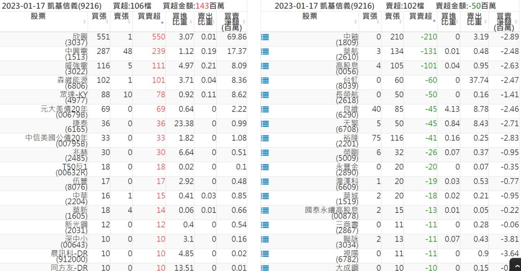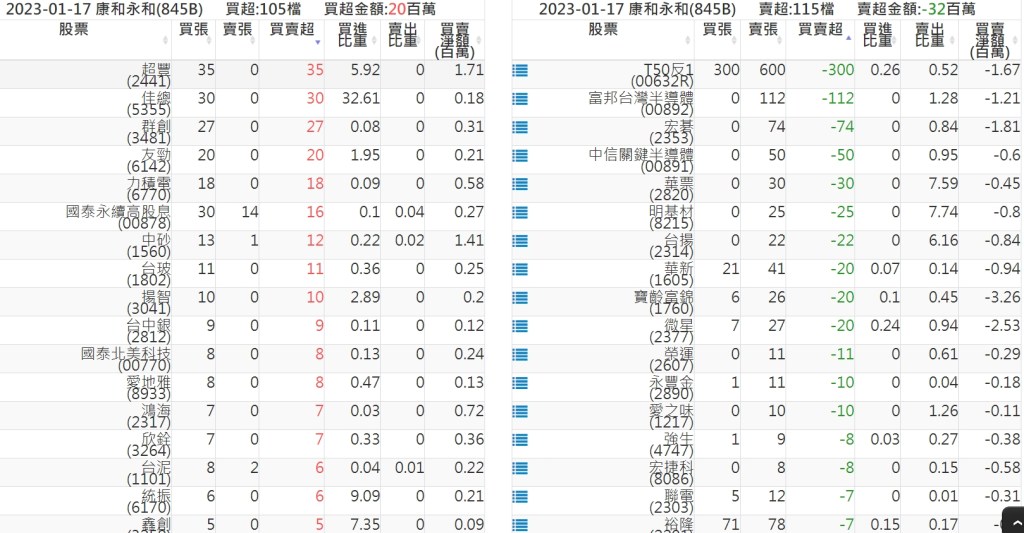 2023-0117關鍵券商買賣超 2023-01-18 股狗網小編 籌碼面每日資訊 發表留言 投資達人APP上線囉!!!『安裝APP』: 關鍵券商買賣超: 臺銀證券(1040): 台灣摩根士丹利(1470): 凱基台北(9268): 凱基信義(9216): 元大土城永寧(9875): 康和永和(845B) : 富邦建國(9658): 免責宣言 本網站文章所提供資訊僅供參考,並無任何推介買賣之意,投資人應自行承擔交易風險。 分享此文: 按一下即可分享至 X(在新視窗中開啟) X 按一下以分享至 Facebook(在新視窗中開啟) Facebook 喜歡 正在載入...