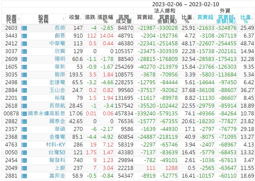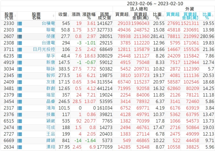 2023/02/06~2023/02/10近5日【外資】買賣超個股 2023-02-12 股狗網小編 投資誌-大盤 發表留言 投資達人APP上線囉!!!『安裝APP』: 外資本周累積【賣超】約24億元。 【上市外資買超個股】(以金額排行,單位:萬) 【上市外資賣超個股】(以金額排行,單位:萬) 【上櫃外資買超個股】(以金額排行,單位:萬) 【上櫃外資賣超個股】(以金額排行,單位:萬) 免責宣言 本網站文章所提供資訊僅供參考,並無任何推介買賣之意,投資人應自行承擔交易風險。 分享此文: 分享到 X(在新視窗中開啟) X 分享到 Facebook(在新視窗中開啟) Facebook 喜歡 正在載入...