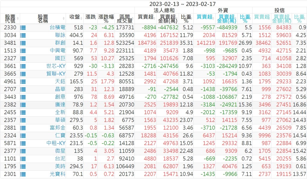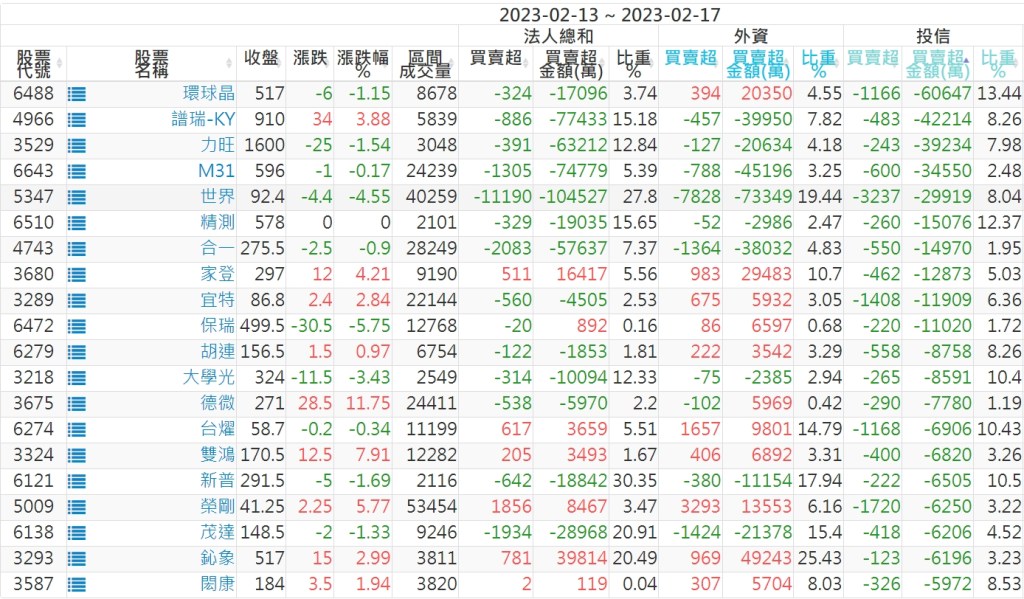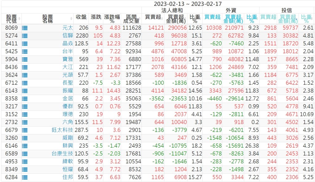 2023/02/13~2023/02/17近5日【投信】買賣超個股 2023-02-19 股狗網小編 投資誌-大盤 發表留言 投資達人APP上線囉!!!『安裝APP』: 【上市投信買超個股】(以金額排行,單位:萬) 【上市投信賣超個股】(以金額排行,單位:萬) 【上櫃投信買超個股】(以金額排行,單位:萬) 【上櫃投信賣超個股】(以金額排行,單位:萬) 免責宣言 本網站文章所提供資訊僅供參考,並無任何推介買賣之意,投資人應自行承擔交易風險。 分享此文: 分享到 X(在新視窗中開啟) X 分享到 Facebook(在新視窗中開啟) Facebook 喜歡 正在載入...