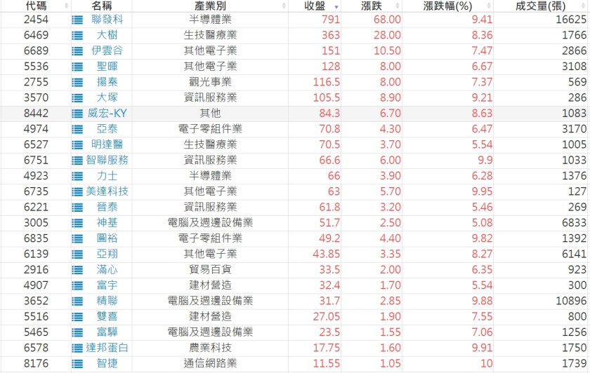 2023-0301股價創20日新高爆量上漲股 2023-03-02 股狗網小編 選股條件 發表留言 投資達人APP上線囉!!!『安裝APP』: 利用股狗選股的選股條件可以【挑選突破20日新高,爆量上漲起漲點股票】 1.股狗選股 https://www.stockdog.com.tw 2.選股條件: a.收盤價創20日新高 b.當日漲幅 > 2% C.成交量大於5日均量2倍 免責宣言 本網站文章所提供資訊僅供參考,並無任何推介買賣之意,投資人應自行承擔交易風險。 分享此文: 分享到 X(在新視窗中開啟) X 分享到 Facebook(在新視窗中開啟) Facebook 喜歡 正在載入...
