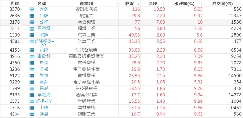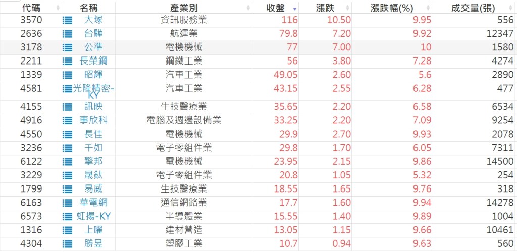 2023-0313股價創20日新高爆量上漲股 2023-03-14 股狗網小編 選股條件 發表留言 投資達人APP上線囉!!!『安裝APP』: 利用股狗選股的選股條件可以【挑選突破20日新高,爆量上漲起漲點股票】 1.股狗選股 https://www.stockdog.com.tw 2.選股條件: a.收盤價創20日新高 b.當日漲幅 > 2% C.成交量大於5日均量2倍 免責宣言 本網站文章所提供資訊僅供參考,並無任何推介買賣之意,投資人應自行承擔交易風險。 分享此文: 分享到 X(在新視窗中開啟) X 分享到 Facebook(在新視窗中開啟) Facebook 喜歡 正在載入...