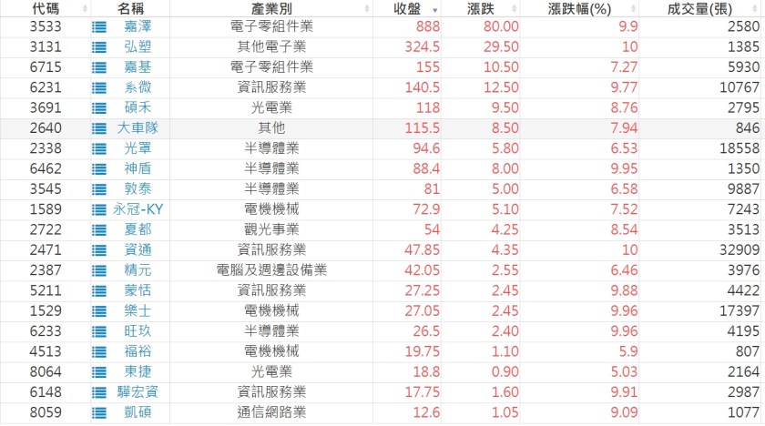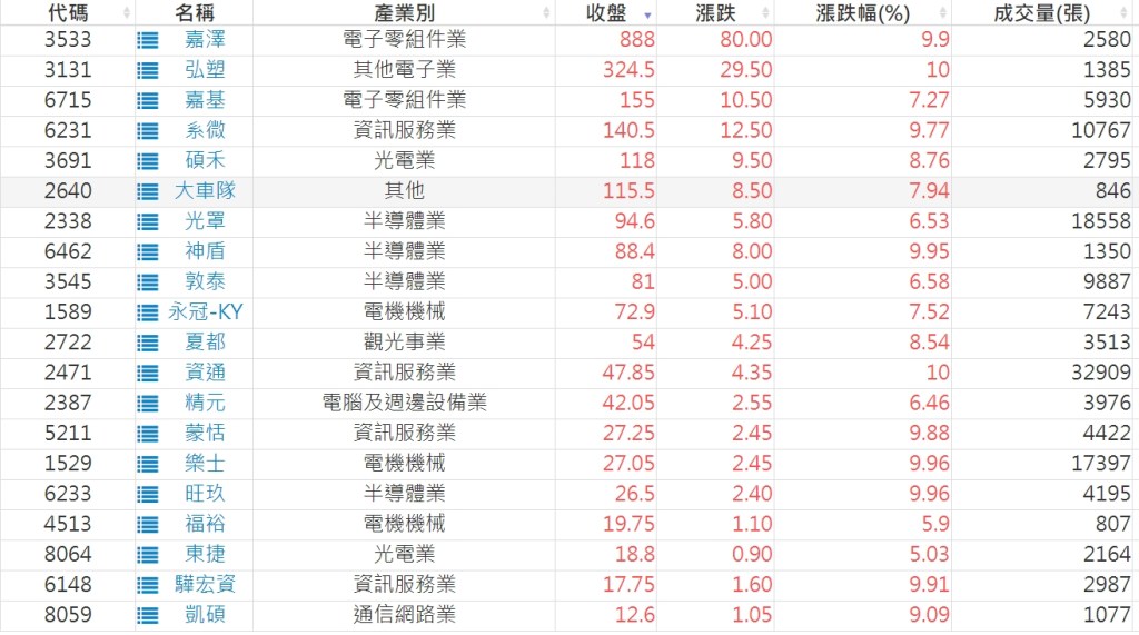 2023-0320股價創20日新高爆量上漲股 2023-03-21 股狗網小編 選股條件 發表留言 投資達人APP上線囉!!!『安裝APP』: 利用股狗選股的選股條件可以【挑選突破20日新高,爆量上漲起漲點股票】 1.股狗選股 https://www.stockdog.com.tw 2.選股條件: a.收盤價創20日新高 b.當日漲幅 > 2% C.成交量大於5日均量2倍 免責宣言 本網站文章所提供資訊僅供參考,並無任何推介買賣之意,投資人應自行承擔交易風險。 分享此文: 分享到 X(在新視窗中開啟) X 分享到 Facebook(在新視窗中開啟) Facebook 喜歡 正在載入...