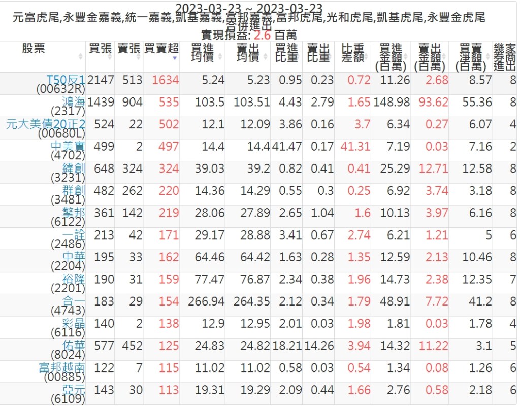 2023-0323主力買賣超個股 2023-03-24 股狗網小編 籌碼面每日資訊 發表留言 投資達人APP上線囉!!!『安裝APP』: 可參考下文 『如何查詢當沖、隔日沖分公司券商買賣』 主力當沖券商: 『元富虎尾』,『永豐金嘉義』,『統一嘉義』,『凱基嘉義』,『富邦嘉義』,『富邦虎尾』,『光和虎尾』,『凱基虎尾』,『永豐金虎尾』。 『當沖標的』 『買超股票』 『賣超股票』 免責宣言 本網站文章所提供資訊僅供參考,並無任何推介買賣之意,投資人應自行承擔交易風險。 分享此文: 分享到 X(在新視窗中開啟) X 分享到 Facebook(在新視窗中開啟) Facebook 喜歡 正在載入...