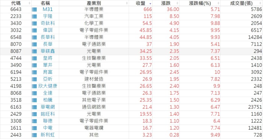 2023-0331股價創20日新高爆量上漲股 2023-04-01 股狗網小編 選股條件 發表留言 投資達人APP上線囉!!!『安裝APP』: 利用股狗選股的選股條件可以【挑選突破20日新高,爆量上漲起漲點股票】 1.股狗選股 https://www.stockdog.com.tw 2.選股條件: a.收盤價創20日新高 b.當日漲幅 > 2% C.成交量大於5日均量2倍 免責宣言 本網站文章所提供資訊僅供參考,並無任何推介買賣之意,投資人應自行承擔交易風險。 分享此文: 分享到 X(在新視窗中開啟) X 分享到 Facebook(在新視窗中開啟) Facebook 喜歡 正在載入...