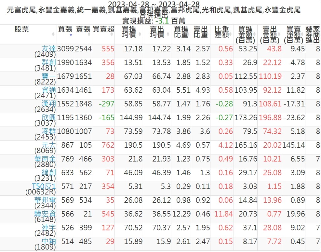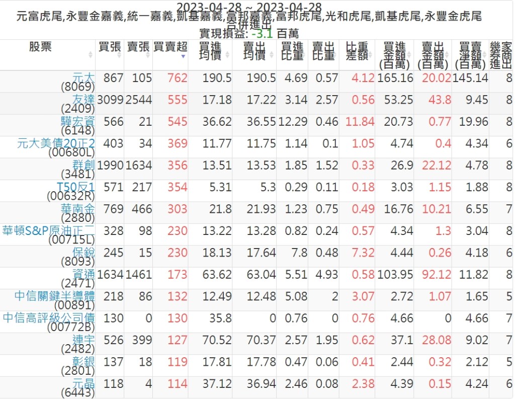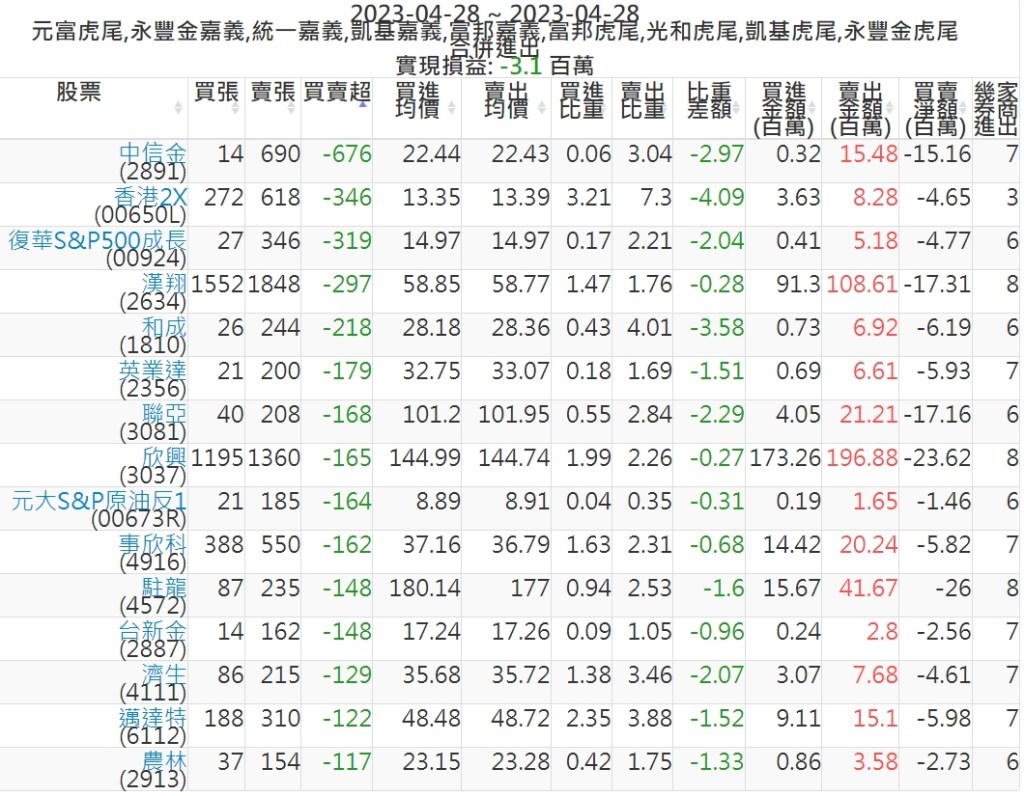 2023-0428主力買賣超個股 2023-04-29 股狗網小編 籌碼面每日資訊 發表留言 投資達人APP上線囉!!!『安裝APP』: 可參考下文 『如何查詢當沖、隔日沖分公司券商買賣』 主力當沖券商: 『元富虎尾』,『永豐金嘉義』,『統一嘉義』,『凱基嘉義』,『富邦嘉義』,『富邦虎尾』,『光和虎尾』,『凱基虎尾』,『永豐金虎尾』。 『當沖標的』 『買超股票』 『賣超股票』 免責宣言 本網站文章所提供資訊僅供參考,並無任何推介買賣之意,投資人應自行承擔交易風險。 分享此文: 按一下即可分享至 X(在新視窗中開啟) X 按一下以分享至 Facebook(在新視窗中開啟) Facebook 喜歡 正在載入...