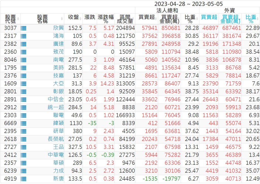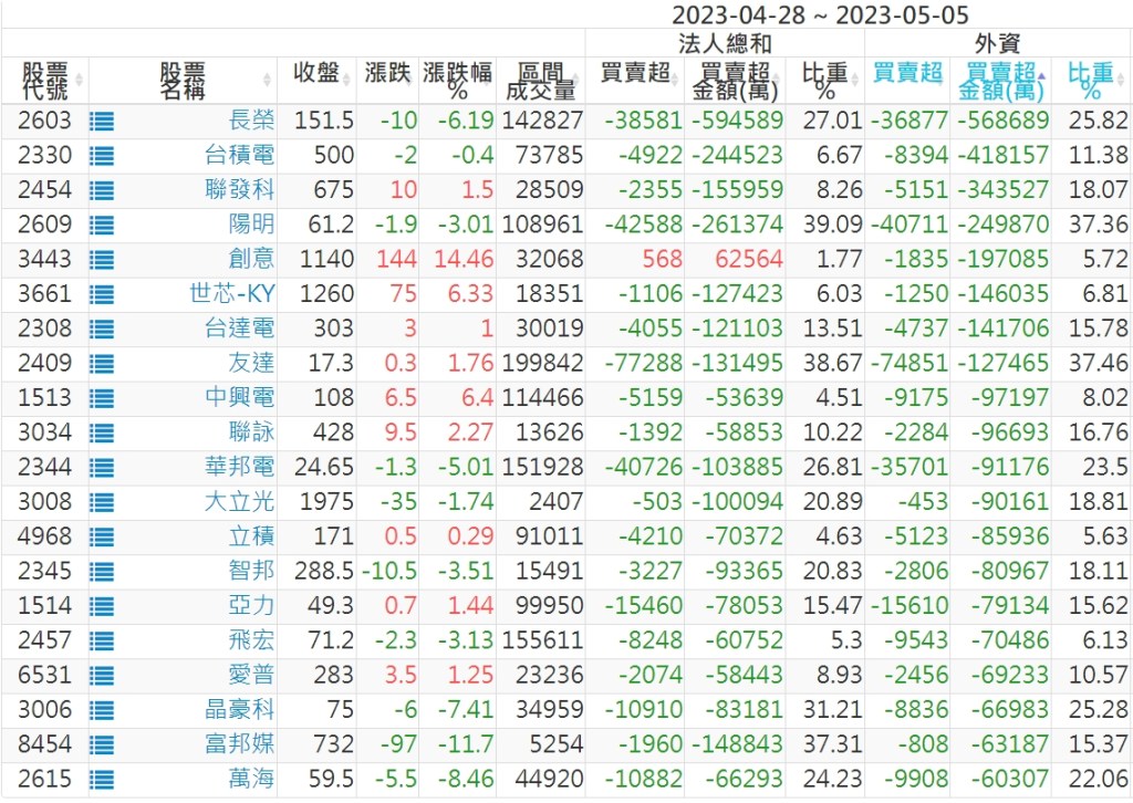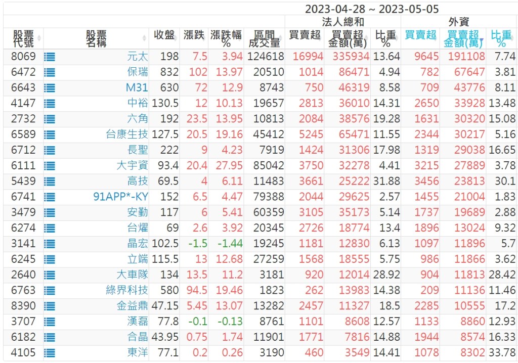 2023/04/28~2023/05/05近5日【外資】買賣超個股 2023-05-07 股狗網小編 投資誌-大盤 發表留言 投資達人APP上線囉!!!『安裝APP』: 外資本周累積【賣超】約379億元。 【上市外資買超個股】(以金額排行,單位:萬) 【上市外資賣超個股】(以金額排行,單位:萬) 【上櫃外資買超個股】(以金額排行,單位:萬) 【上櫃外資賣超個股】(以金額排行,單位:萬) 免責宣言 本網站文章所提供資訊僅供參考,並無任何推介買賣之意,投資人應自行承擔交易風險。 分享此文: 分享到 X(在新視窗中開啟) X 分享到 Facebook(在新視窗中開啟) Facebook 喜歡 正在載入...
