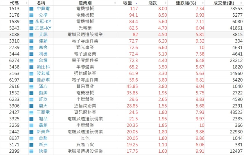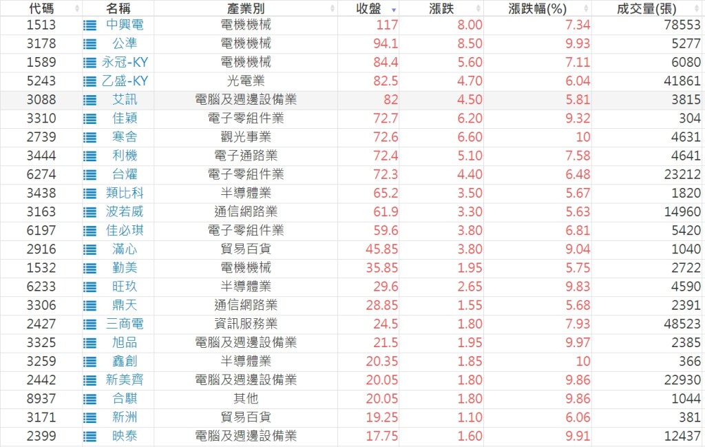 2023-0522股價創20日新高爆量上漲股 2023-05-23 股狗網小編 選股條件 發表留言 投資達人APP上線囉!!!『安裝APP』: 利用股狗選股的選股條件可以【挑選突破20日新高,爆量上漲起漲點股票】 1.股狗選股 https://www.stockdog.com.tw 2.選股條件: a.收盤價創20日新高 b.當日漲幅 > 2% C.成交量大於5日均量2倍 免責宣言 本網站文章所提供資訊僅供參考,並無任何推介買賣之意,投資人應自行承擔交易風險。 分享此文: 分享到 X(在新視窗中開啟) X 分享到 Facebook(在新視窗中開啟) Facebook 喜歡 正在載入...