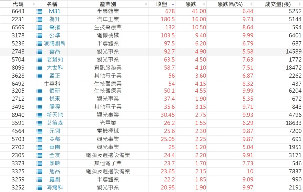 2023-0523股價創20日新高爆量上漲股 2023-05-24 股狗網小編 選股條件 發表留言 投資達人APP上線囉!!!『安裝APP』: 利用股狗選股的選股條件可以【挑選突破20日新高,爆量上漲起漲點股票】 1.股狗選股 https://www.stockdog.com.tw 2.選股條件: a.收盤價創20日新高 b.當日漲幅 > 2% C.成交量大於5日均量2倍 免責宣言 本網站文章所提供資訊僅供參考,並無任何推介買賣之意,投資人應自行承擔交易風險。 分享此文: 分享到 X(在新視窗中開啟) X 分享到 Facebook(在新視窗中開啟) Facebook 喜歡 正在載入...
