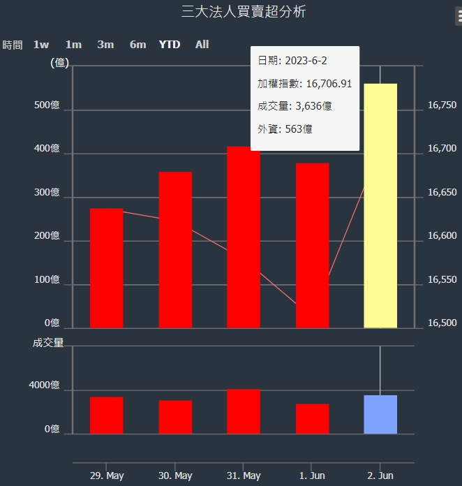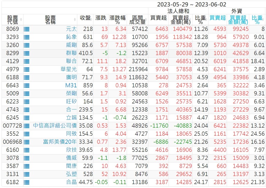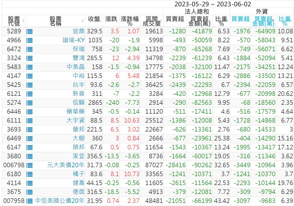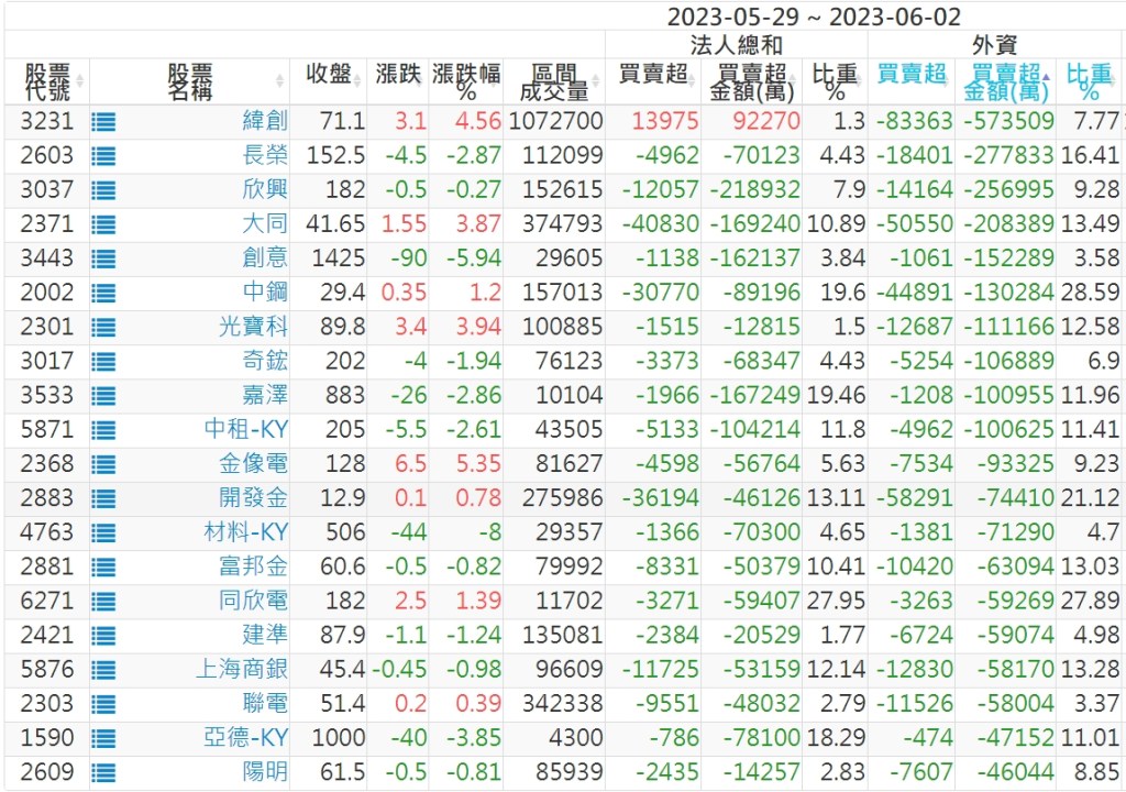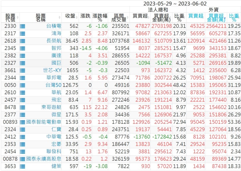 2023/05/29~2023/06/02近5日【外資】買賣超個股 2023-06-04 股狗網小編 投資誌-大盤 發表留言 投資達人APP上線囉!!!『安裝APP』: 外資本周累積【買超】約563億元。 【上市外資買超個股】(以金額排行,單位:萬) 【上市外資賣超個股】(以金額排行,單位:萬) 【上櫃外資買超個股】(以金額排行,單位:萬) 【上櫃外資賣超個股】(以金額排行,單位:萬) 免責宣言 本網站文章所提供資訊僅供參考,並無任何推介買賣之意,投資人應自行承擔交易風險。 分享此文: 按一下即可分享至 X(在新視窗中開啟) X 按一下以分享至 Facebook(在新視窗中開啟) Facebook 喜歡 正在載入...
