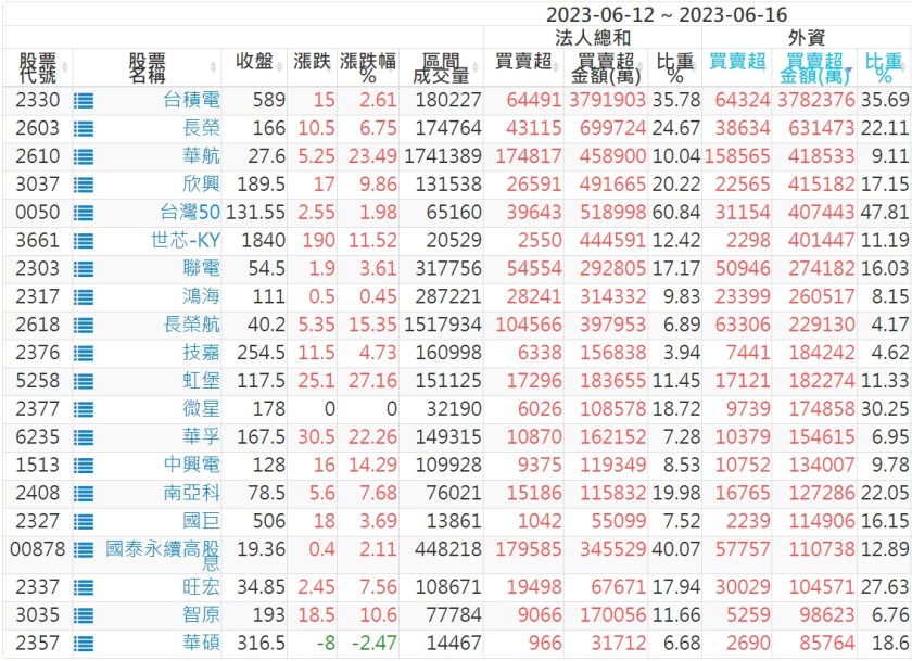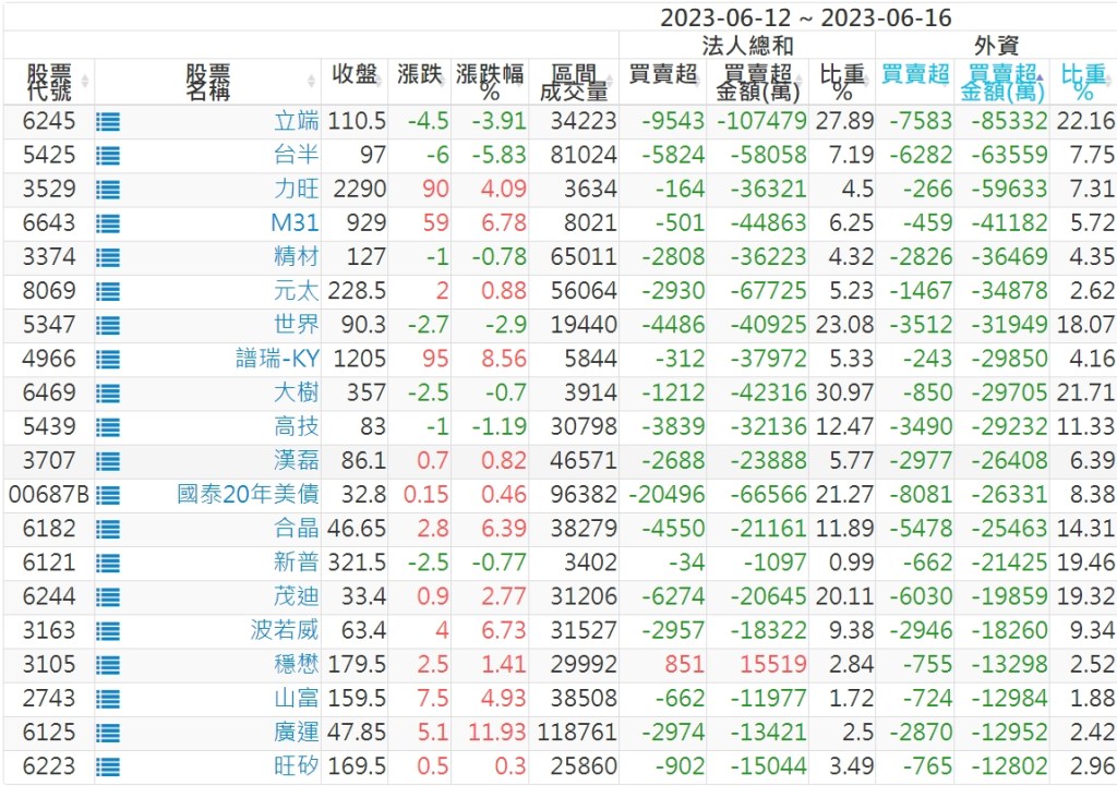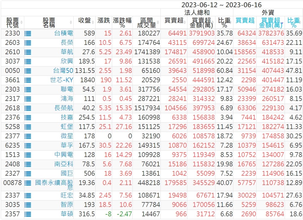 2023/06/12~2023/06/16近5日【外資】買賣超個股 2023-06-18 股狗網小編 投資誌-大盤 發表留言 投資達人APP上線囉!!!『安裝APP』: 外資本周累積【買超】約649億元。 【上市外資買超個股】(以金額排行,單位:萬) 【上市外資賣超個股】(以金額排行,單位:萬) 【上櫃外資買超個股】(以金額排行,單位:萬) 【上櫃外資賣超個股】(以金額排行,單位:萬) 免責宣言 本網站文章所提供資訊僅供參考,並無任何推介買賣之意,投資人應自行承擔交易風險。 分享此文: 按一下即可分享至 X(在新視窗中開啟) X 按一下以分享至 Facebook(在新視窗中開啟) Facebook 喜歡 正在載入...