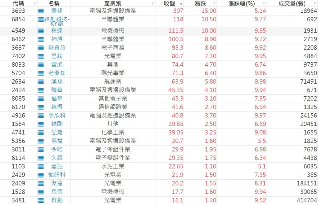 2023-0619股價創20日新高爆量上漲股 2023-06-20 股狗網小編 選股條件 發表留言 投資達人APP上線囉!!!『安裝APP』: 利用股狗選股的選股條件可以【挑選突破20日新高,爆量上漲起漲點股票】 1.股狗選股 https://www.stockdog.com.tw 2.選股條件: a.收盤價創20日新高 b.當日漲幅 > 2% C.成交量大於5日均量2倍 免責宣言 本網站文章所提供資訊僅供參考,並無任何推介買賣之意,投資人應自行承擔交易風險。 分享此文: 按一下即可分享至 X(在新視窗中開啟) X 按一下以分享至 Facebook(在新視窗中開啟) Facebook 喜歡 正在載入...