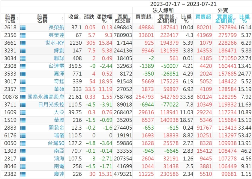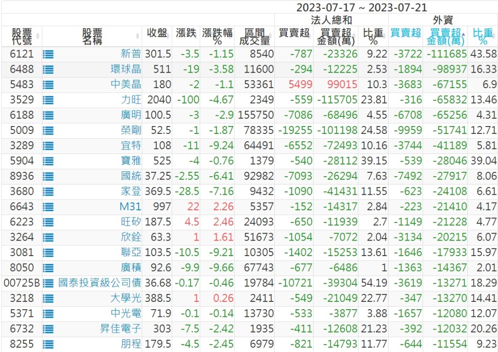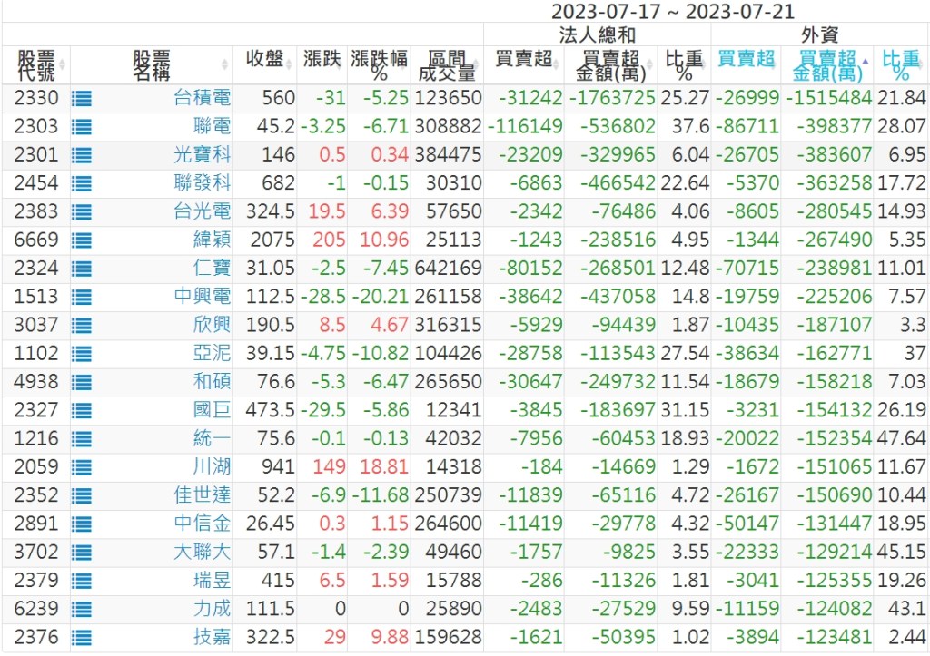 2023/07/17~2023/07/21近5日【外資】買賣超個股 2023-07-23 股狗網小編 投資誌-大盤 發表留言 投資達人APP上線囉!!!『安裝APP』: 外資本周累積【賣超】約382億元。 【上市外資買超個股】(以金額排行,單位:萬) 【上市外資賣超個股】(以金額排行,單位:萬) 【上櫃外資買超個股】(以金額排行,單位:萬) 【上櫃外資賣超個股】(以金額排行,單位:萬) 免責宣言 本網站文章所提供資訊僅供參考,並無任何推介買賣之意,投資人應自行承擔交易風險。 分享此文: 分享到 X(在新視窗中開啟) X 分享到 Facebook(在新視窗中開啟) Facebook 喜歡 正在載入...