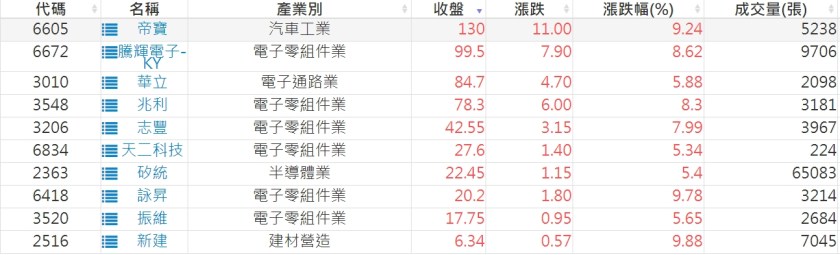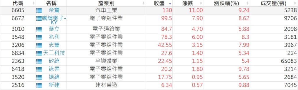 2023-0809股價創20日新高爆量上漲股 2023-08-10 股狗網小編 選股條件 發表留言 投資達人APP上線囉!!!『安裝APP』: 利用股狗選股的選股條件可以【挑選突破20日新高,爆量上漲起漲點股票】 1.股狗選股 https://www.stockdog.com.tw 2.選股條件: a.收盤價創20日新高 b.當日漲幅 > 2% C.成交量大於5日均量2倍 免責宣言 本網站文章所提供資訊僅供參考,並無任何推介買賣之意,投資人應自行承擔交易風險。 分享此文: 分享到 X(在新視窗中開啟) X 分享到 Facebook(在新視窗中開啟) Facebook 喜歡 正在載入...