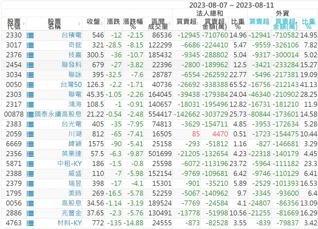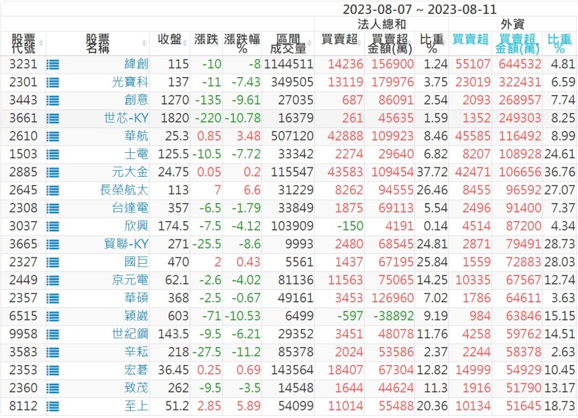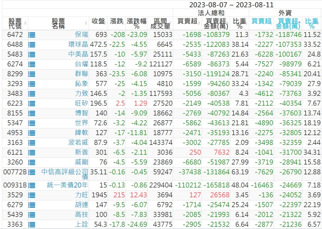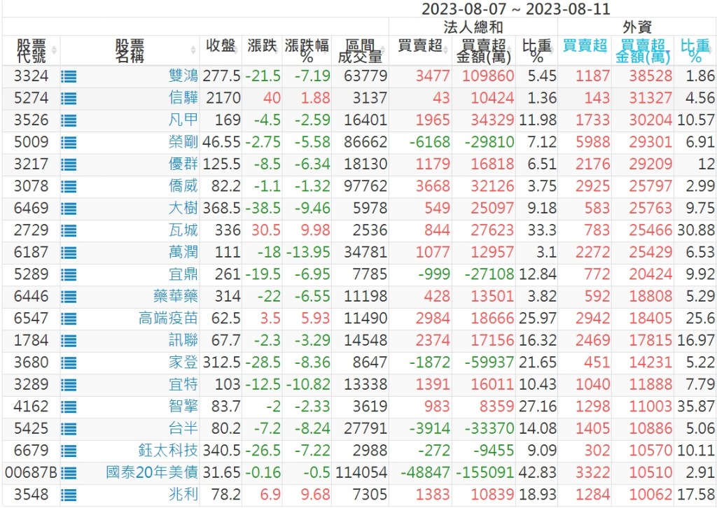 2023/08/07~2023/08/11近5日【外資】買賣超個股 2023-08-13 股狗網小編 投資誌-大盤 發表留言 投資達人APP上線囉!!!『安裝APP』: 外資本周累積【賣超】約331億元。 【上市外資買超個股】(以金額排行,單位:萬) 【上市外資賣超個股】(以金額排行,單位:萬) 【上櫃外資買超個股】(以金額排行,單位:萬) 【上櫃外資賣超個股】(以金額排行,單位:萬) 免責宣言 本網站文章所提供資訊僅供參考,並無任何推介買賣之意,投資人應自行承擔交易風險。 分享此文: 分享到 X(在新視窗中開啟) X 分享到 Facebook(在新視窗中開啟) Facebook 喜歡 正在載入...