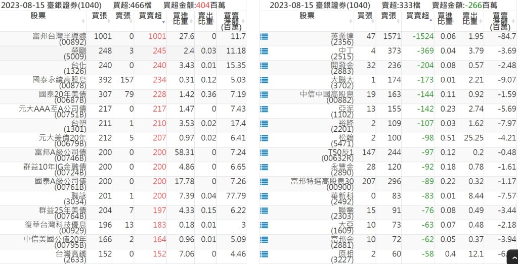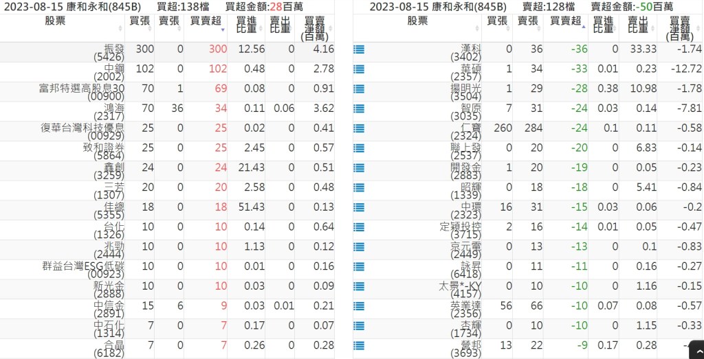 2023-0815關鍵券商買賣超 2023-08-16 股狗網小編 籌碼面每日資訊 發表留言 投資達人APP上線囉!!!『安裝APP』: 關鍵券商買賣超: 臺銀證券(1040): 台灣摩根士丹利(1470): 凱基台北(9268): 凱基信義(9216): 元大土城永寧(9875): 康和永和(845B) : 富邦建國(9658): 免責宣言 本網站文章所提供資訊僅供參考,並無任何推介買賣之意,投資人應自行承擔交易風險。 分享此文: 分享到 X(在新視窗中開啟) X 分享到 Facebook(在新視窗中開啟) Facebook 喜歡 正在載入...