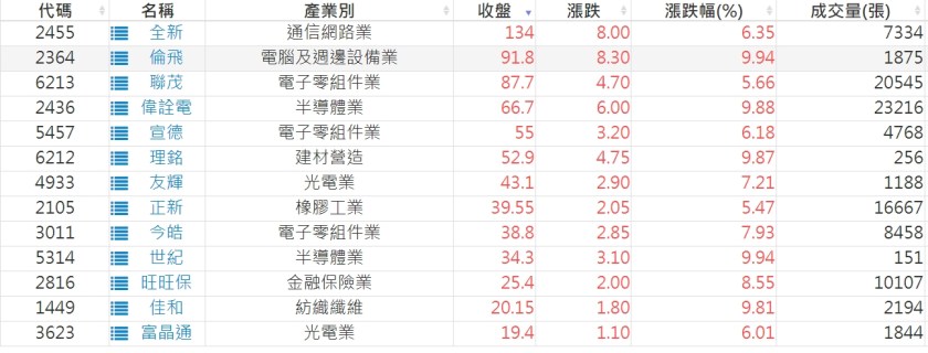 2023-0829股價創20日新高爆量上漲股 2023-08-30 股狗網小編 選股條件 發表留言 投資達人APP上線囉!!!『安裝APP』: 利用股狗選股的選股條件可以【挑選突破20日新高,爆量上漲起漲點股票】 1.股狗選股 https://www.stockdog.com.tw 2.選股條件: a.收盤價創20日新高 b.當日漲幅 > 2% C.成交量大於5日均量2倍 免責宣言 本網站文章所提供資訊僅供參考,並無任何推介買賣之意,投資人應自行承擔交易風險。 分享此文: 分享到 X(在新視窗中開啟) X 分享到 Facebook(在新視窗中開啟) Facebook 喜歡 正在載入...