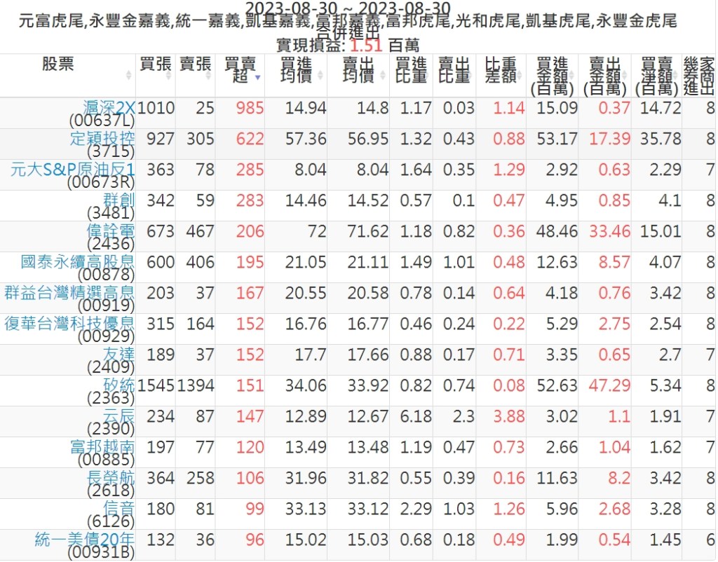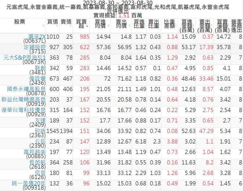 2023-0830主力買賣超個股 2023-08-31 股狗網小編 籌碼面每日資訊 發表留言 投資達人APP上線囉!!!『安裝APP』: 可參考下文 『如何查詢當沖、隔日沖分公司券商買賣』 主力當沖券商: 『元富虎尾』,『永豐金嘉義』,『統一嘉義』,『凱基嘉義』,『富邦嘉義』,『富邦虎尾』,『光和虎尾』,『凱基虎尾』,『永豐金虎尾』。 『當沖標的』 『買超股票』 『賣超股票』 免責宣言 本網站文章所提供資訊僅供參考,並無任何推介買賣之意,投資人應自行承擔交易風險。 分享此文: 分享到 X(在新視窗中開啟) X 分享到 Facebook(在新視窗中開啟) Facebook 喜歡 正在載入...