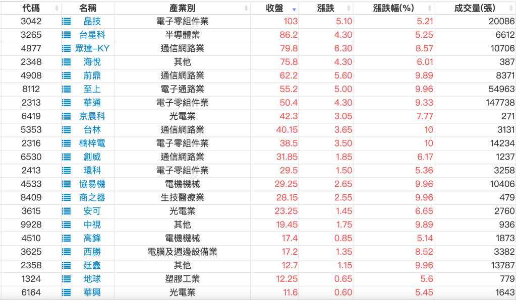 2023-0906股價創20日新高爆量上漲股 2023-09-06 股狗網小編 選股條件 發表留言 投資達人APP上線囉!!!『安裝APP』: 利用股狗選股的選股條件可以【挑選突破20日新高,爆量上漲起漲點股票】 1.股狗選股 https://www.stockdog.com.tw 2.選股條件: a.收盤價創20日新高 b.當日漲幅 > 2% C.成交量大於5日均量2倍 免責宣言 本網站文章所提供資訊僅供參考,並無任何推介買賣之意,投資人應自行承擔交易風險。 分享此文: 分享到 X(在新視窗中開啟) X 分享到 Facebook(在新視窗中開啟) Facebook 喜歡 正在載入...