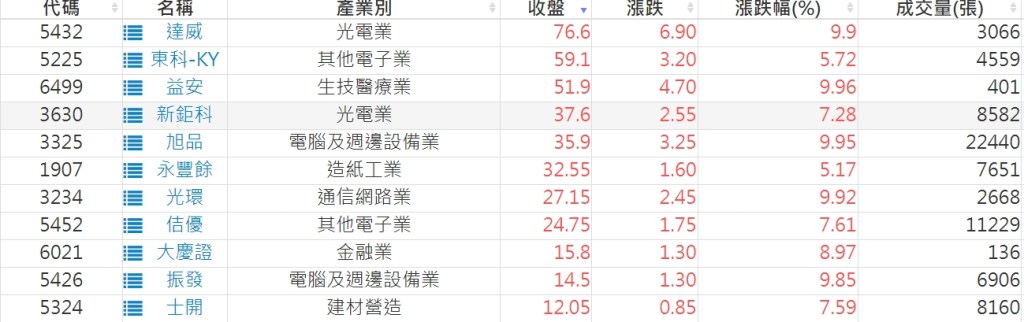 2023-0928股價創20日新高爆量上漲股 2023-09-29 股狗網小編 選股條件 發表留言 投資達人APP上線囉!!!『安裝APP』: 利用股狗選股的選股條件可以【挑選突破20日新高,爆量上漲起漲點股票】 1.股狗選股 https://www.stockdog.com.tw 2.選股條件: a.收盤價創20日新高 b.當日漲幅 > 2% C.成交量大於5日均量2倍 免責宣言 本網站文章所提供資訊僅供參考,並無任何推介買賣之意,投資人應自行承擔交易風險。 分享此文: 分享到 X(在新視窗中開啟) X 分享到 Facebook(在新視窗中開啟) Facebook 喜歡 正在載入...