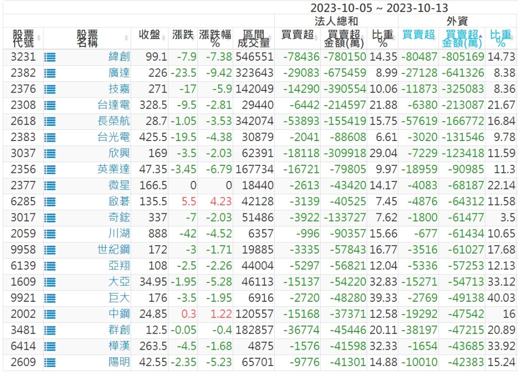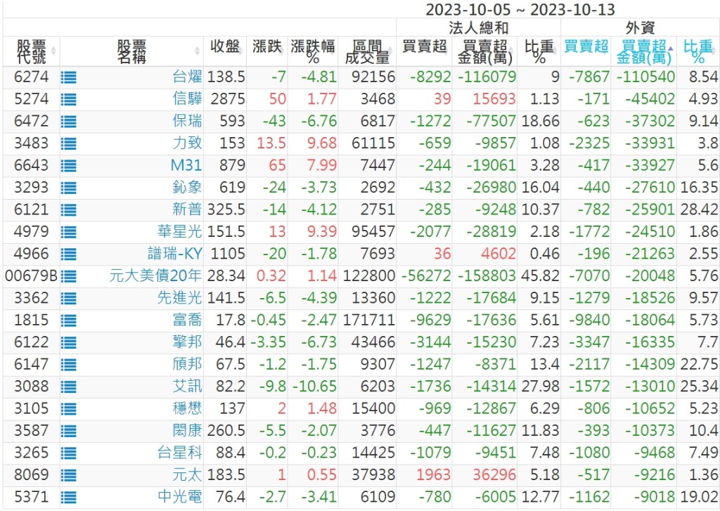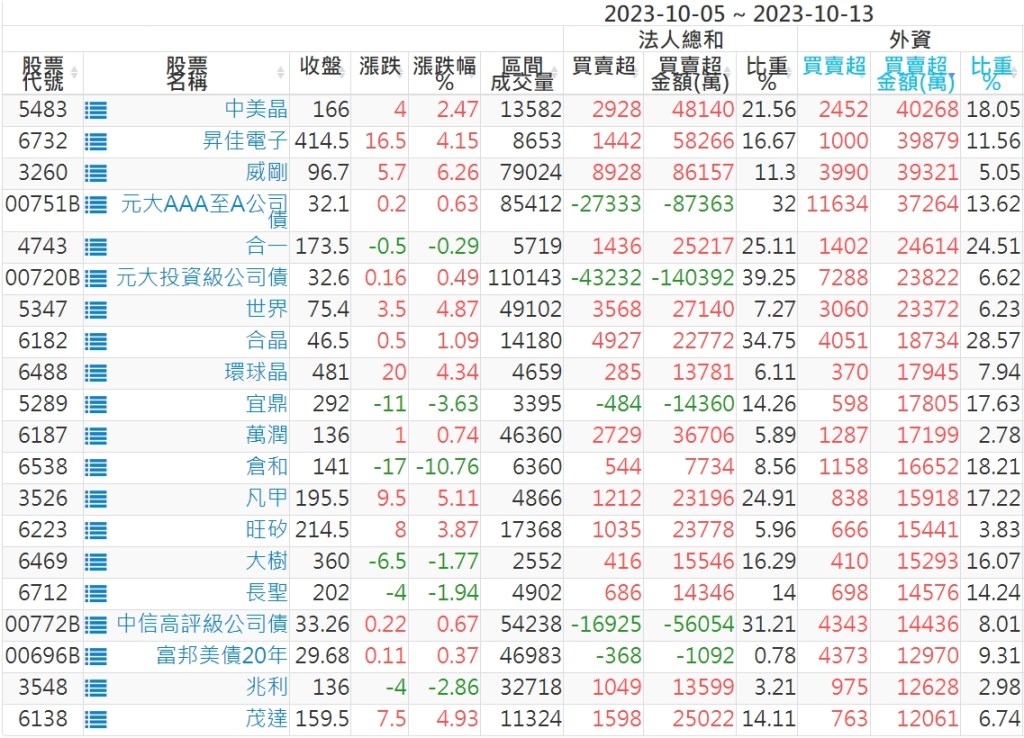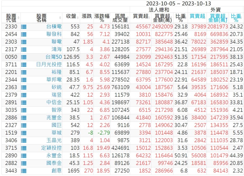 2023/10/05~2023/10/13近5日【外資】買賣超個股 2023-10-15 股狗網小編 投資誌-大盤 發表留言 投資達人APP上線囉!!!『安裝APP』: 外資本周累積【買超】約362億元。 【上市外資買超個股】(以金額排行,單位:萬) 【上市外資賣超個股】(以金額排行,單位:萬) 【上櫃外資買超個股】(以金額排行,單位:萬) 【上櫃外資賣超個股】(以金額排行,單位:萬) 免責宣言 本網站文章所提供資訊僅供參考,並無任何推介買賣之意,投資人應自行承擔交易風險。 分享此文: 分享到 X(在新視窗中開啟) X 分享到 Facebook(在新視窗中開啟) Facebook 喜歡 正在載入...