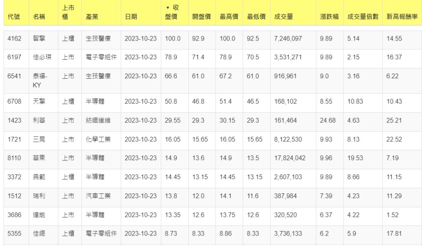 2023-1023股價創20日新高爆量上漲股