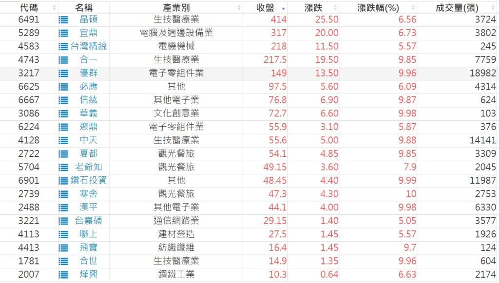 2023-1107股價創20日新高爆量上漲股 2023-11-08 股狗網小編 選股條件 發表留言 投資達人APP上線囉!!!『安裝APP』: 利用股狗選股的選股條件可以【挑選突破20日新高,爆量上漲起漲點股票】 1.股狗選股 https://www.stockdog.com.tw 2.選股條件: a.收盤價創20日新高 b.當日漲幅 > 2% C.成交量大於5日均量2倍 免責宣言 本網站文章所提供資訊僅供參考,並無任何推介買賣之意,投資人應自行承擔交易風險。 分享此文: 分享到 X(在新視窗中開啟) X 分享到 Facebook(在新視窗中開啟) Facebook 喜歡 正在載入...