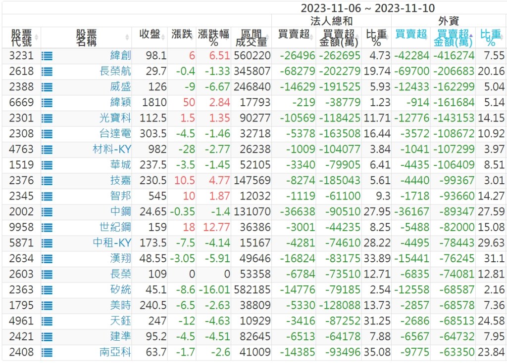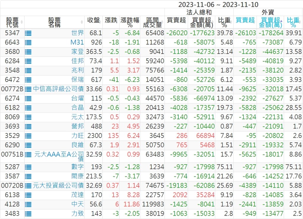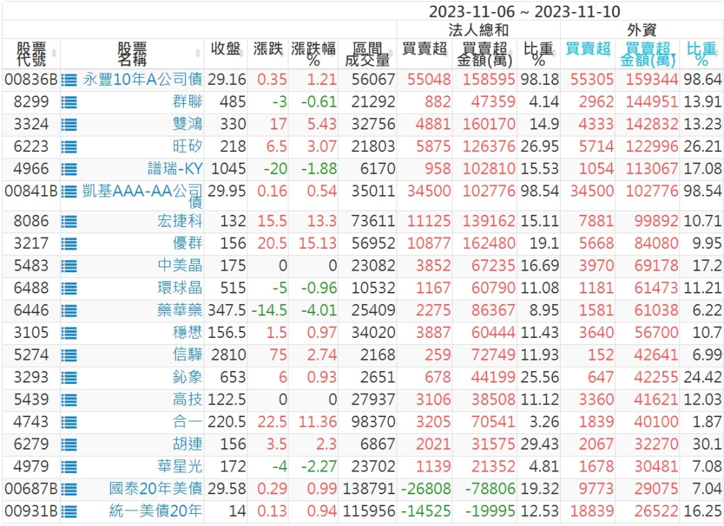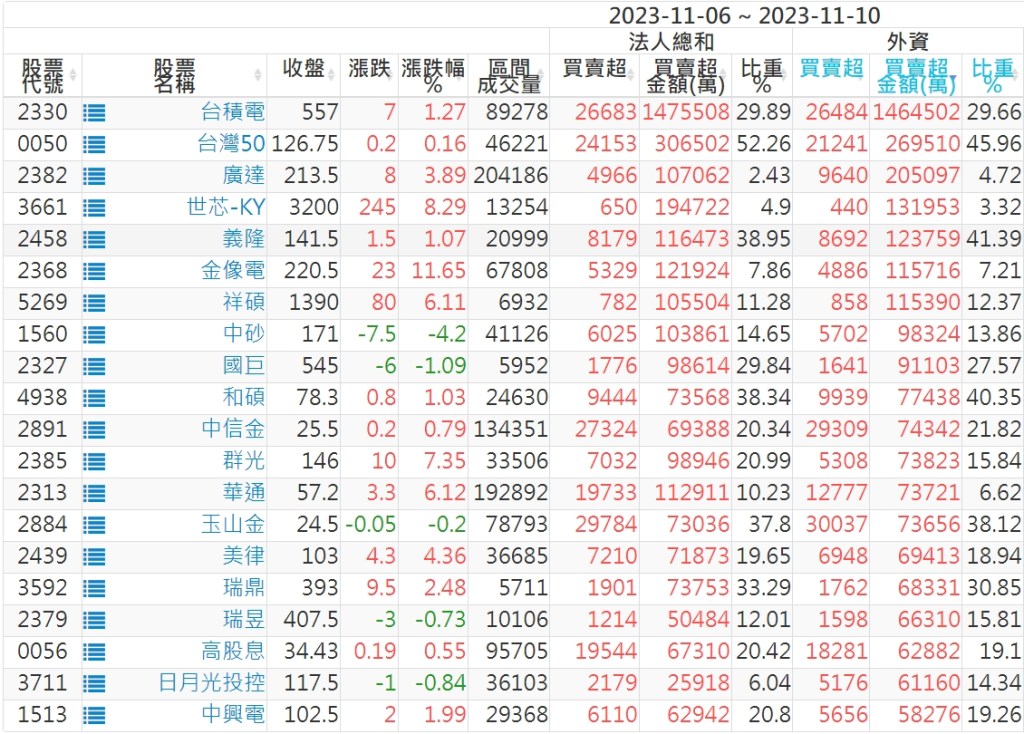 2023/11/06~2023/11/10近5日【外資】買賣超個股 2023-11-12 股狗網小編 投資誌-大盤 發表留言 投資達人APP上線囉!!!『安裝APP』: 外資本周累積【買超】約160億元。 【上市外資買超個股】(以金額排行,單位:萬) 【上市外資賣超個股】(以金額排行,單位:萬) 【上櫃外資買超個股】(以金額排行,單位:萬) 【上櫃外資賣超個股】(以金額排行,單位:萬) 免責宣言 本網站文章所提供資訊僅供參考,並無任何推介買賣之意,投資人應自行承擔交易風險。 分享此文: 分享到 X(在新視窗中開啟) X 分享到 Facebook(在新視窗中開啟) Facebook 喜歡 正在載入...
