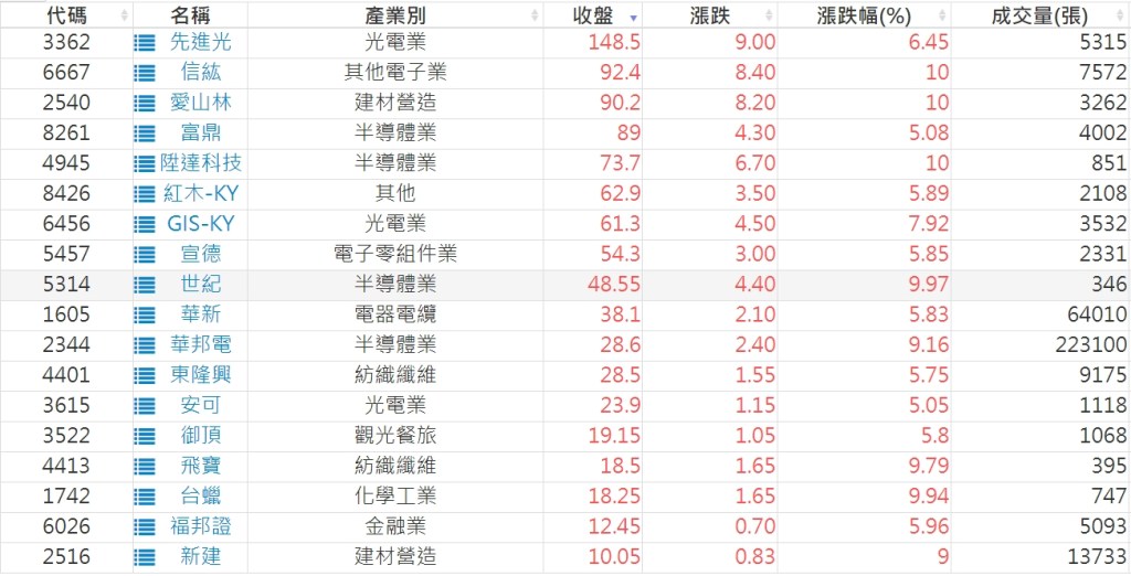 2023-1115股價創20日新高爆量上漲股 2023-11-16 股狗網小編 選股條件 發表留言 投資達人APP上線囉!!!『安裝APP』: 利用股狗選股的選股條件可以【挑選突破20日新高,爆量上漲起漲點股票】 1.股狗選股 https://www.stockdog.com.tw 2.選股條件: a.收盤價創20日新高 b.當日漲幅 > 2% C.成交量大於5日均量2倍 免責宣言 本網站文章所提供資訊僅供參考,並無任何推介買賣之意,投資人應自行承擔交易風險。 分享此文: 分享到 X(在新視窗中開啟) X 分享到 Facebook(在新視窗中開啟) Facebook 喜歡 正在載入...