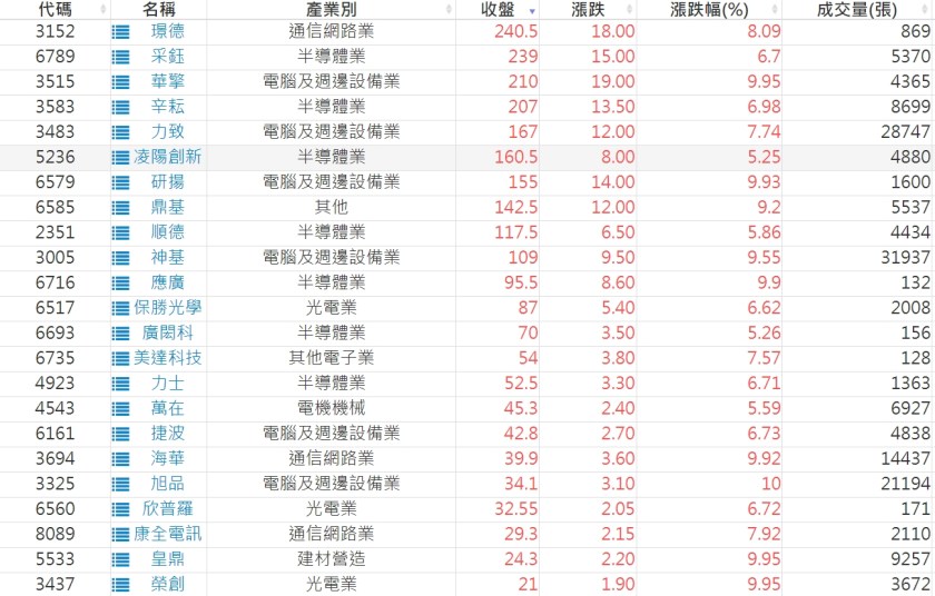 2023-1121股價創20日新高爆量上漲股 2023-11-22 股狗網小編 選股條件 發表留言 投資達人APP上線囉!!!『安裝APP』: 利用股狗選股的選股條件可以【挑選突破20日新高,爆量上漲起漲點股票】 1.股狗選股 https://www.stockdog.com.tw 2.選股條件: a.收盤價創20日新高 b.當日漲幅 > 2% C.成交量大於5日均量2倍 免責宣言 本網站文章所提供資訊僅供參考,並無任何推介買賣之意,投資人應自行承擔交易風險。 分享此文: 分享到 X(在新視窗中開啟) X 分享到 Facebook(在新視窗中開啟) Facebook 喜歡 正在載入...