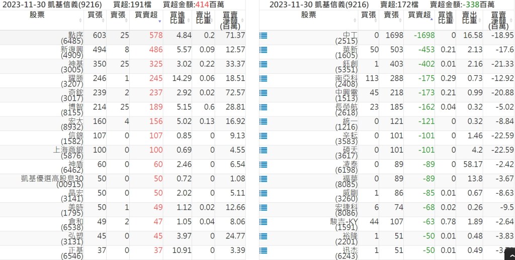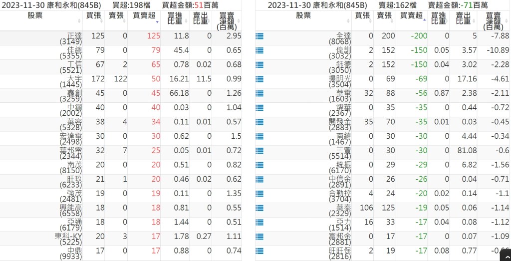 2023-1130關鍵券商買賣超 2023-11-30 股狗網小編 籌碼面每日資訊 發表留言 投資達人APP上線囉!!!『安裝APP』: 關鍵券商買賣超: 臺銀證券(1040): 台灣摩根士丹利(1470): 凱基台北(9268): 凱基信義(9216): 元大土城永寧(9875): 康和永和(845B) : 富邦建國(9658): 免責宣言 本網站文章所提供資訊僅供參考,並無任何推介買賣之意,投資人應自行承擔交易風險。 分享此文: 按一下即可分享至 X(在新視窗中開啟) X 按一下以分享至 Facebook(在新視窗中開啟) Facebook 喜歡 正在載入...