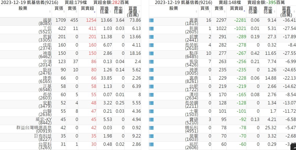2023-1219關鍵券商買賣超 2023-12-19 股狗網小編 籌碼面每日資訊 發表留言 關鍵券商買賣超: 臺銀證券(1040): 台灣摩根士丹利(1470): 凱基台北(9268): 凱基信義(9216): 元大土城永寧(9875): 康和永和(845B) : 富邦建國(9658): 免責宣言 本網站文章所提供資訊僅供參考,並無任何推介買賣之意,投資人應自行承擔交易風險。 分享此文: 分享到 X(在新視窗中開啟) X 分享到 Facebook(在新視窗中開啟) Facebook 喜歡 正在載入...