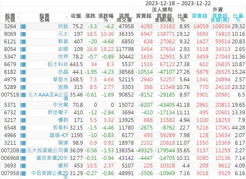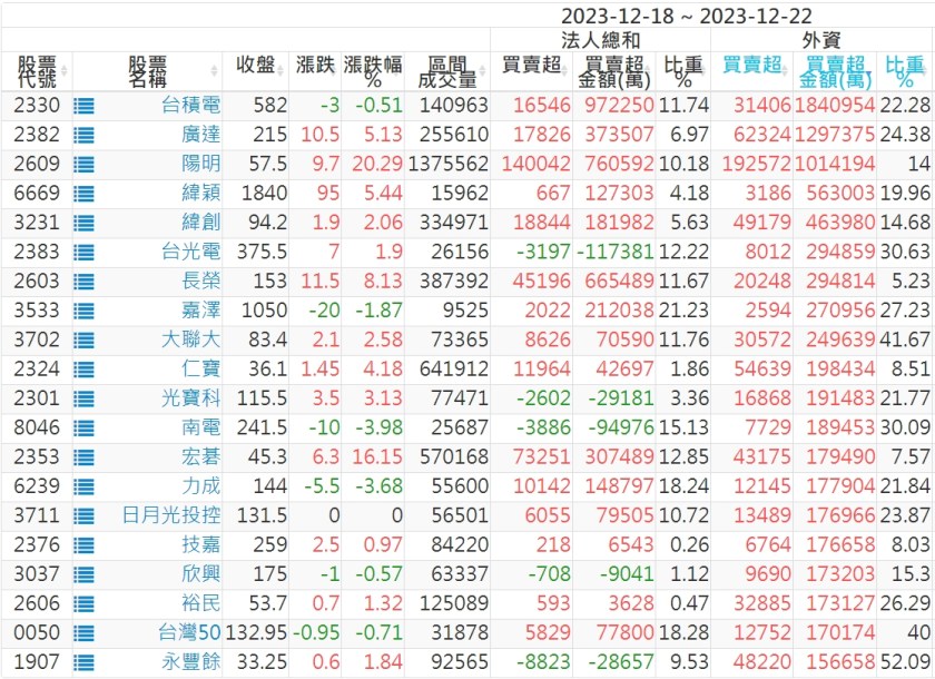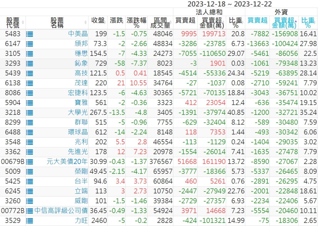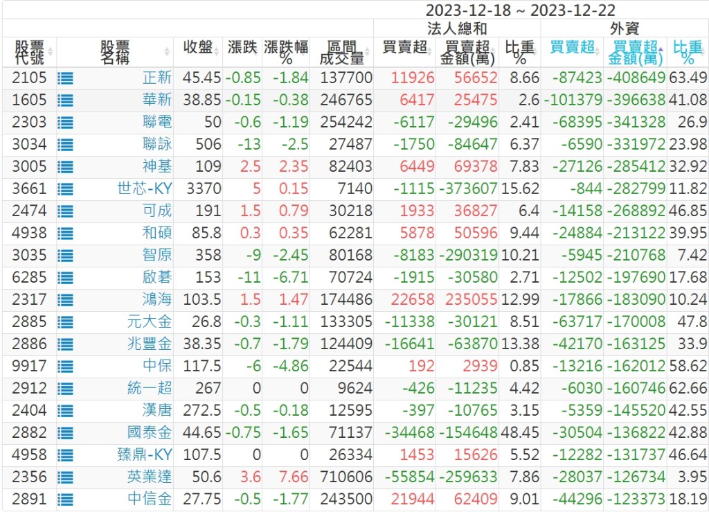 2023/12/18~2023/12/22近5日【外資】買賣超個股 2023-12-24 股狗網小編 投資誌-大盤 發表留言 投資達人APP上線囉!!!『安裝APP』: 外資本周累積【買超】約289億元。 【上市外資買超個股】(以金額排行,單位:萬) 【上市外資賣超個股】(以金額排行,單位:萬) 【上櫃外資買超個股】(以金額排行,單位:萬) 【上櫃外資賣超個股】(以金額排行,單位:萬) 免責宣言 本網站文章所提供資訊僅供參考,並無任何推介買賣之意,投資人應自行承擔交易風險。 分享此文: 按一下即可分享至 X(在新視窗中開啟) X 按一下以分享至 Facebook(在新視窗中開啟) Facebook 喜歡 正在載入...