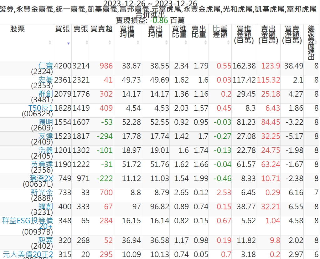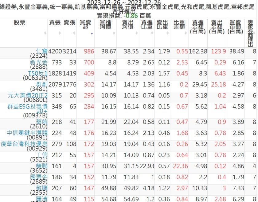 2023-1226主力買賣超個股 2023-12-26 股狗網小編 籌碼面每日資訊 發表留言 可參考下文 『如何查詢當沖、隔日沖分公司券商買賣』 主力當沖券商: 『元富虎尾』,『永豐金嘉義』,『統一嘉義』,『凱基嘉義』,『富邦嘉義』,『富邦虎尾』,『光和虎尾』,『凱基虎尾』,『永豐金虎尾』。 『當沖標的』 『買超股票』 『賣超股票』 免責宣言 本網站文章所提供資訊僅供參考,並無任何推介買賣之意,投資人應自行承擔交易風險。 分享此文: 按一下即可分享至 X(在新視窗中開啟) X 按一下以分享至 Facebook(在新視窗中開啟) Facebook 喜歡 正在載入...