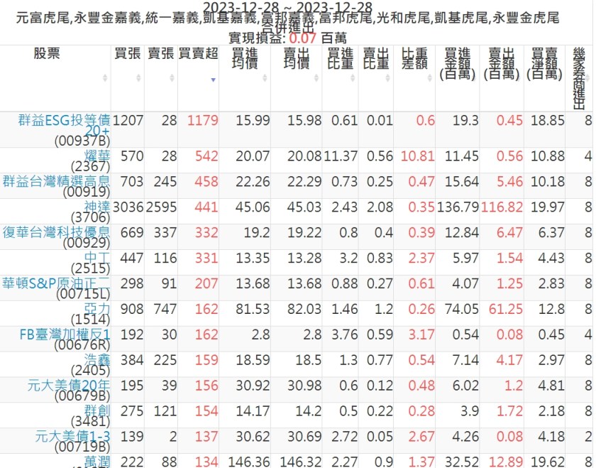 2023-1228主力買賣超個股 2023-12-28 股狗網小編 籌碼面每日資訊 發表留言 可參考下文 『如何查詢當沖、隔日沖分公司券商買賣』 主力當沖券商: 『元富虎尾』,『永豐金嘉義』,『統一嘉義』,『凱基嘉義』,『富邦嘉義』,『富邦虎尾』,『光和虎尾』,『凱基虎尾』,『永豐金虎尾』。 『當沖標的』 『買超股票』 『賣超股票』 免責宣言 本網站文章所提供資訊僅供參考,並無任何推介買賣之意,投資人應自行承擔交易風險。 分享此文: 按一下即可分享至 X(在新視窗中開啟) X 按一下以分享至 Facebook(在新視窗中開啟) Facebook 喜歡 正在載入...