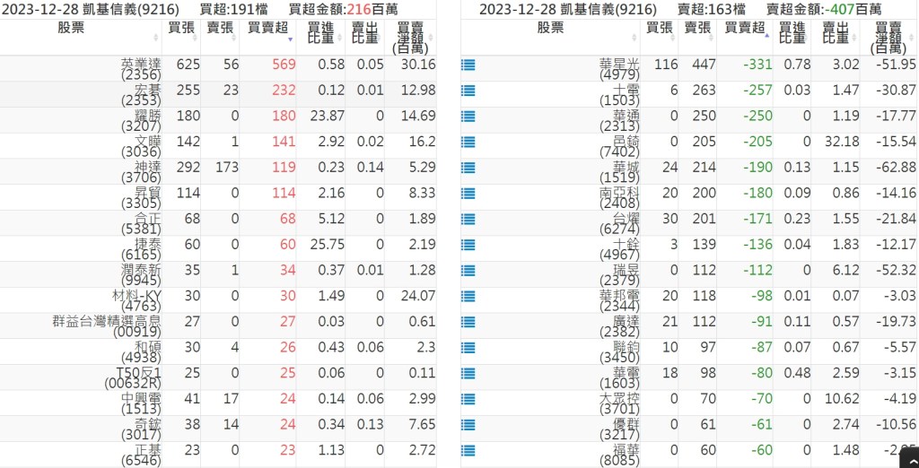 2023-1228關鍵券商買賣超 2023-12-28 aindex168 籌碼面每日資訊 發表留言 關鍵券商買賣超: 臺銀證券(1040): 台灣摩根士丹利(1470): 凱基台北(9268): 凱基信義(9216): 元大土城永寧(9875): 康和永和(845B) : 富邦建國(9658): 免責宣言 本網站文章所提供資訊僅供參考,並無任何推介買賣之意,投資人應自行承擔交易風險。 分享此文: 按一下即可分享至 X(在新視窗中開啟) X 按一下以分享至 Facebook(在新視窗中開啟) Facebook 喜歡 正在載入...