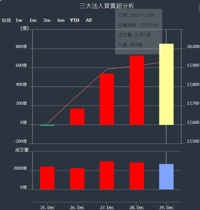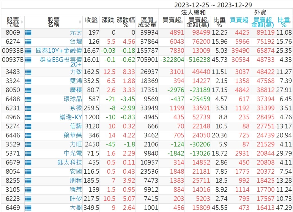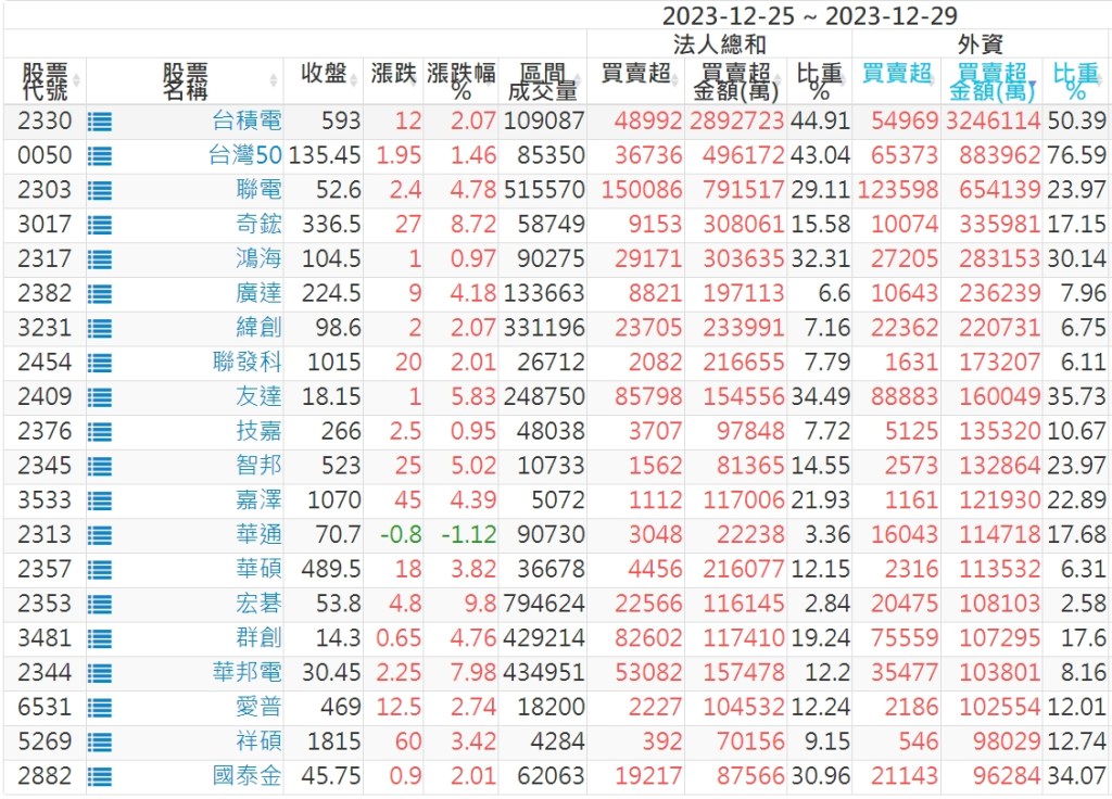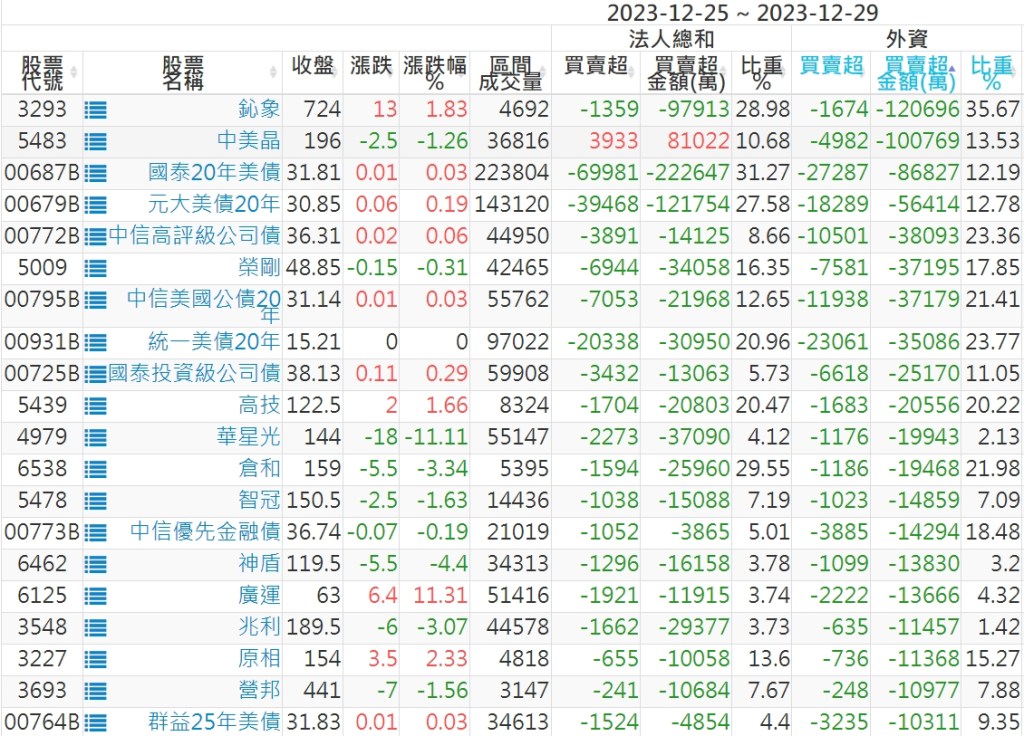 2023/12/25~2023/12/29近5日【外資】買賣超個股 2023-12-31 股狗網小編 投資誌-大盤 發表留言 投資達人APP上線囉!!!『安裝APP』: 外資本周累積【買超】約854億元。 【上市外資買超個股】(以金額排行,單位:萬) 【上市外資賣超個股】(以金額排行,單位:萬) 【上櫃外資買超個股】(以金額排行,單位:萬) 【上櫃外資賣超個股】(以金額排行,單位:萬) 免責宣言 本網站文章所提供資訊僅供參考,並無任何推介買賣之意,投資人應自行承擔交易風險。 分享此文: 按一下即可分享至 X(在新視窗中開啟) X 按一下以分享至 Facebook(在新視窗中開啟) Facebook 喜歡 正在載入...