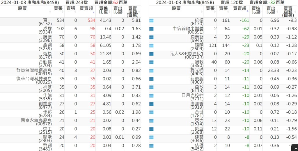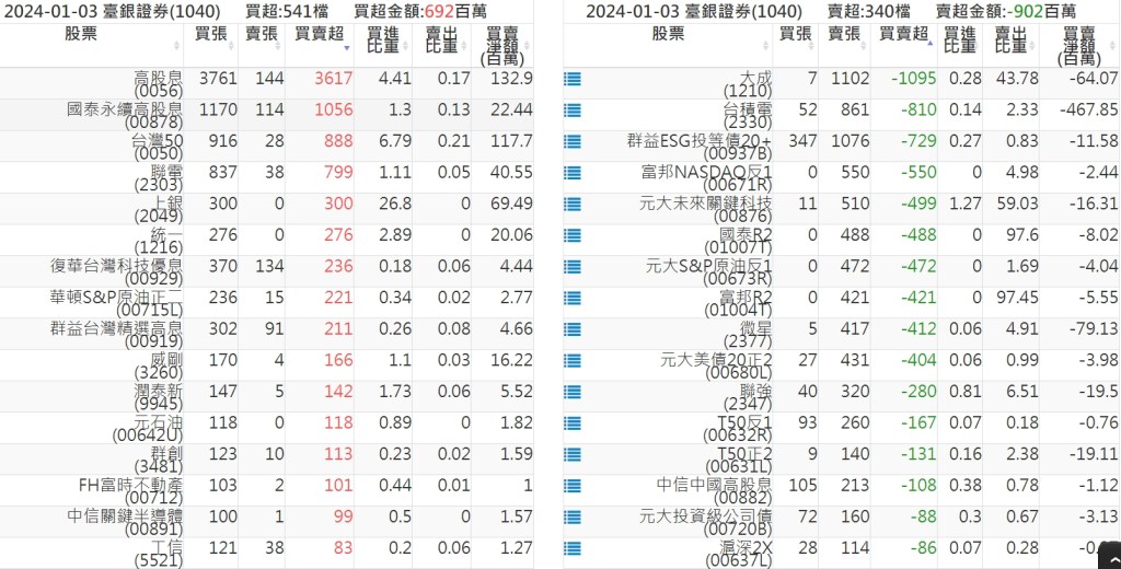 2024-0103關鍵券商買賣超 2024-01-03 股狗網小編 籌碼面每日資訊 發表留言 關鍵券商買賣超: 臺銀證券(1040): 台灣摩根士丹利(1470): 凱基台北(9268): 凱基信義(9216): 元大土城永寧(9875): 康和永和(845B) : 富邦建國(9658): 免責宣言 本網站文章所提供資訊僅供參考,並無任何推介買賣之意,投資人應自行承擔交易風險。 分享此文: 按一下即可分享至 X(在新視窗中開啟) X 按一下以分享至 Facebook(在新視窗中開啟) Facebook 喜歡 正在載入...