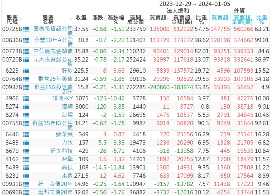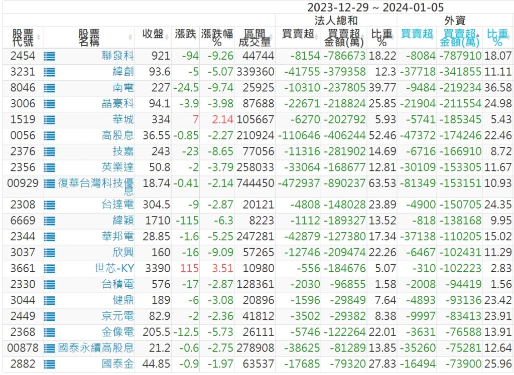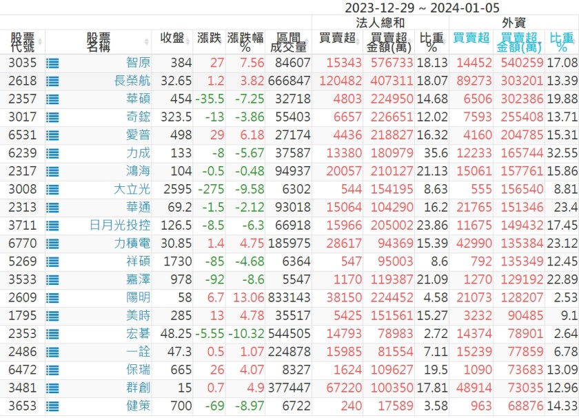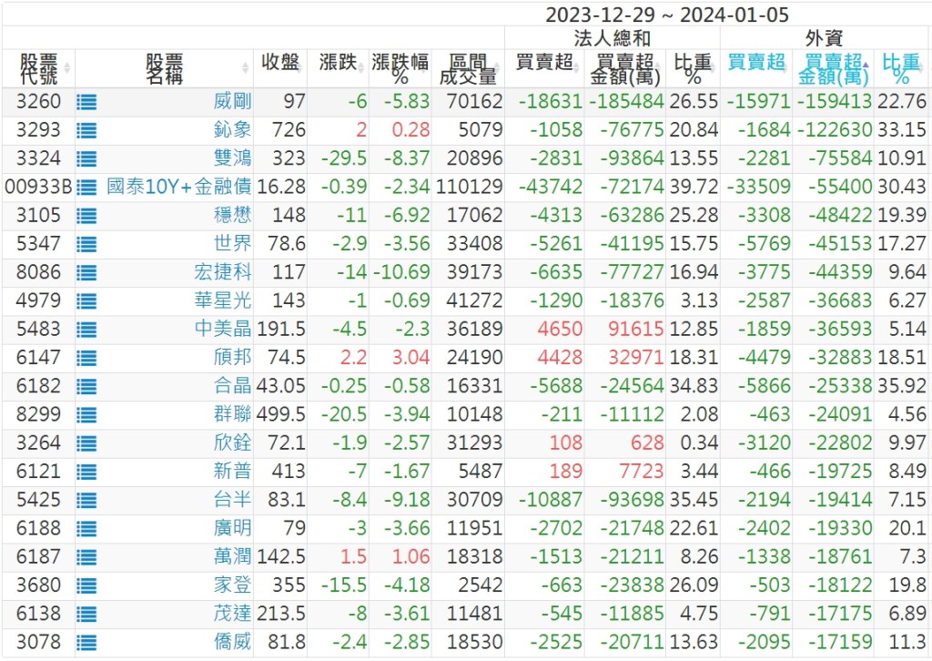 2023/12/29~2024/01/05近5日【外資】買賣超個股 2024-01-07 股狗網小編 投資誌-大盤 發表留言 投資達人APP上線囉!!!『安裝APP』: 外資本周累積【賣超】約173億元。 【上市外資買超個股】(以金額排行,單位:萬) 【上市外資賣超個股】(以金額排行,單位:萬) 【上櫃外資買超個股】(以金額排行,單位:萬) 【上櫃外資賣超個股】(以金額排行,單位:萬) 免責宣言 本網站文章所提供資訊僅供參考,並無任何推介買賣之意,投資人應自行承擔交易風險。 分享此文: 分享到 X(在新視窗中開啟) X 分享到 Facebook(在新視窗中開啟) Facebook 喜歡 正在載入...